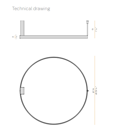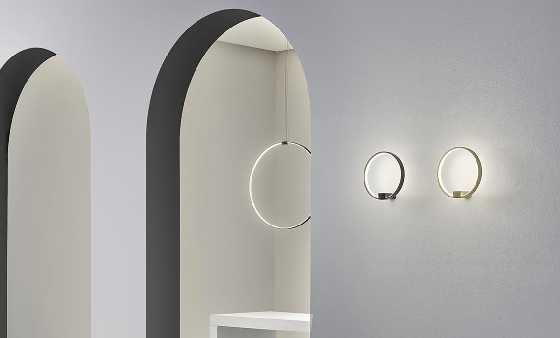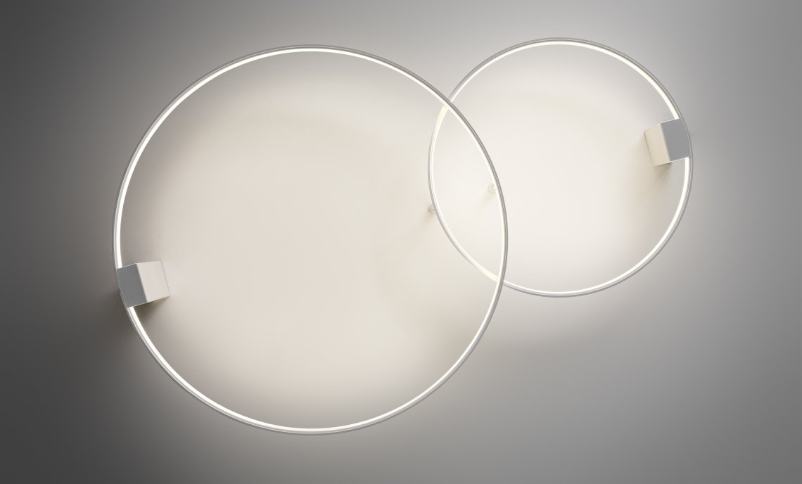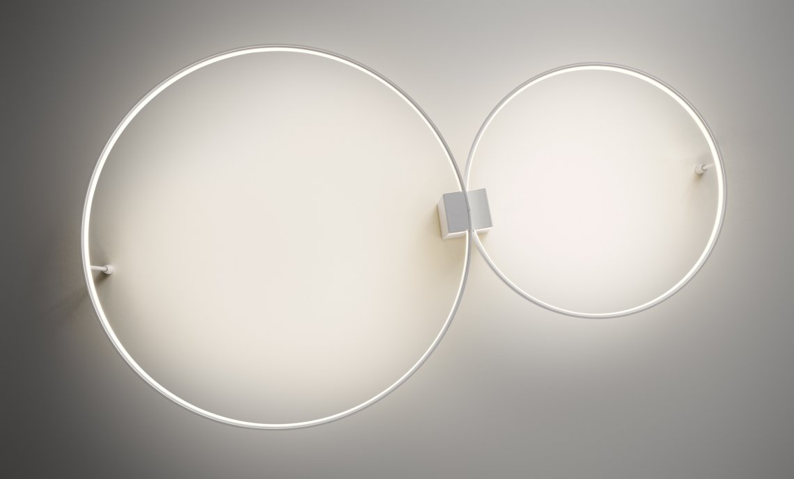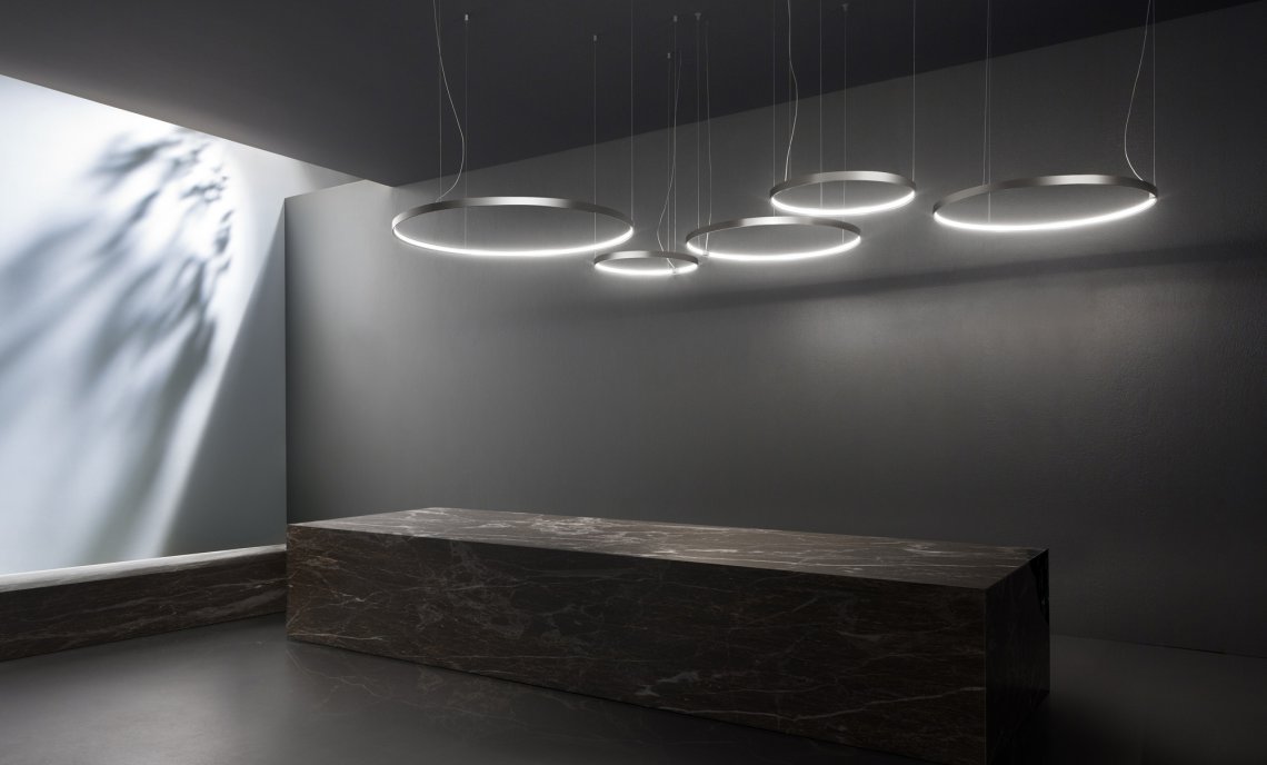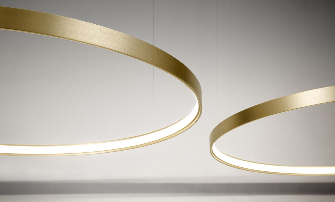 Horizontal suspension lamp, wall and ceiling lamp in extruded curved aluminum, with opal polycarbonate screen. Emission on the internal side provided by LED modules with technology DALI/Push DIM integrated into the canopy. Polyacrilic paint white, black, titanium, bronze and mat brass finishes are available. Canopies for single and multiple configurations with Zero Ellipse and and Zero Square are available, to be ordered separately. Ideal for offices, halls, living, and public spaces, also combinated with Zero Round Acoustic and Arena Acoustic.