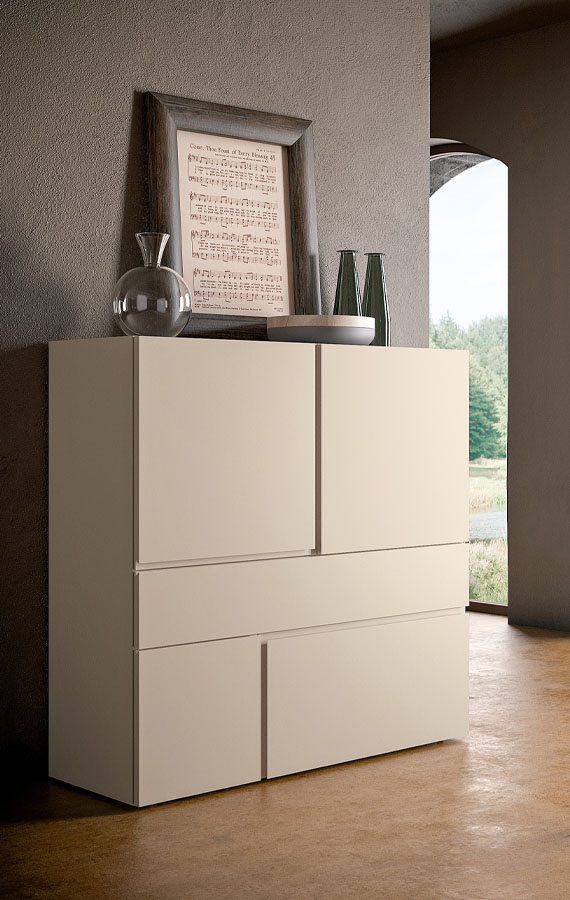 Shapes and surfaces pared back for the ultimate clean look, sharply squared corners and supreme functionality are the distinguishing traits of the Quadra sideboard, whose stand-out feature is the pattern of expertly crafted finger grips on the doors carved out of the solid wood.