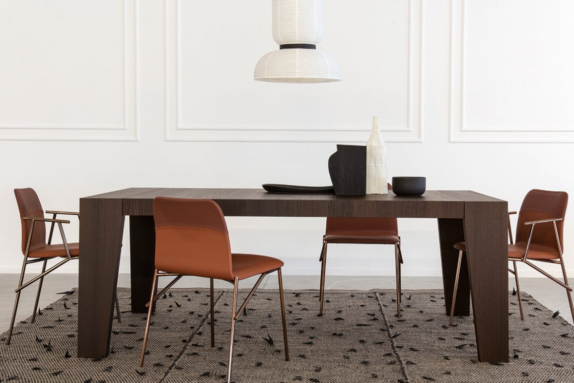 Sturdy, sculptural and extendable: Cartagena is a table that furnishes while offering versatility and functionality. The base, top and the extensions hidden away inside the table are made entirely out of wood which is engraved to achieve a slatted effect. The design of the legs, tapered towards the bottom, is clean-cut and modern. The top and base are joined elegantly and seamlessly through the sides which are enhanced by this interesting detail.