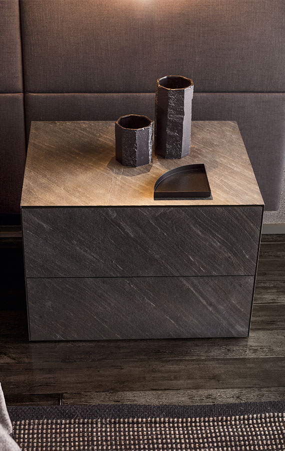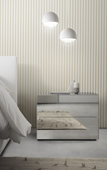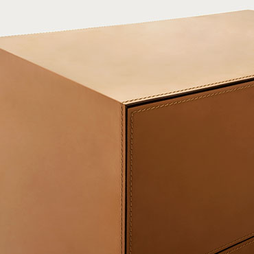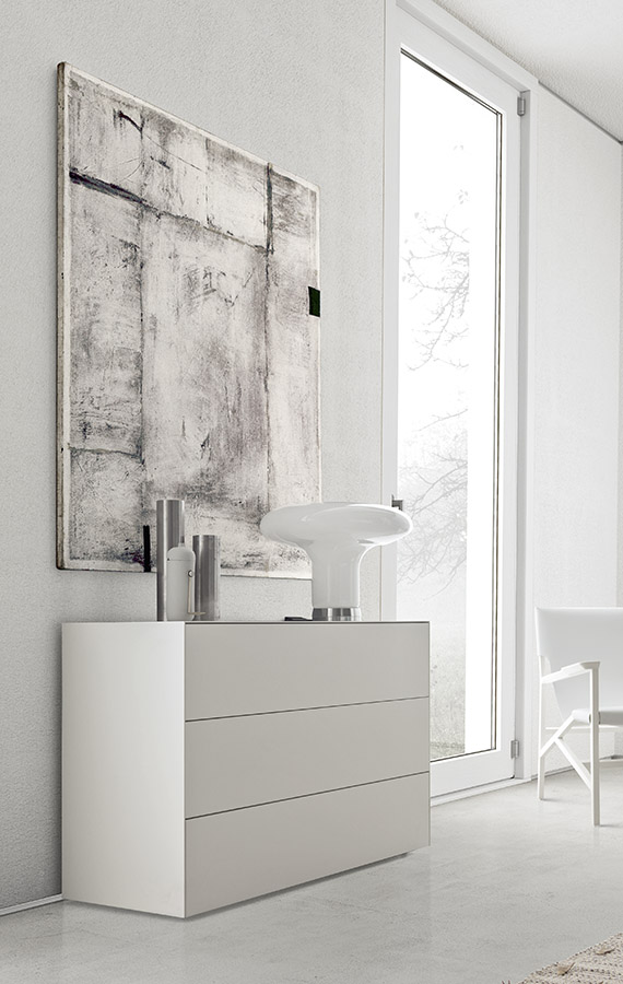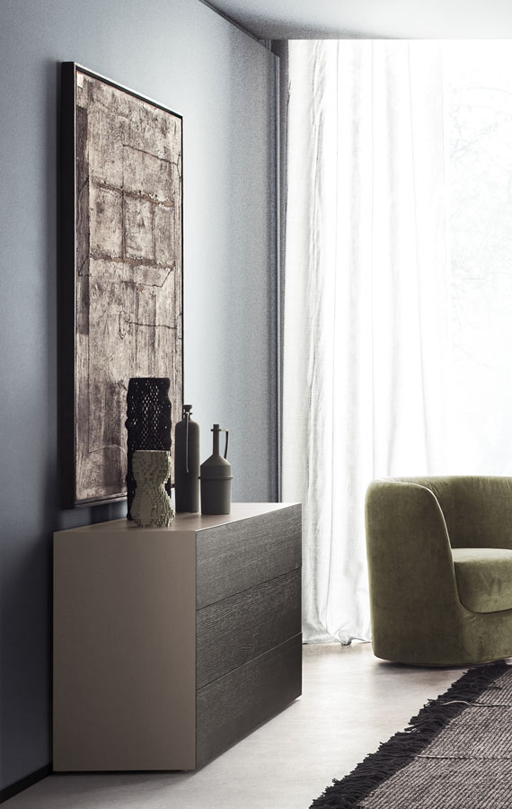Minimalist in every detail, Norma features a push-to-open mechanism designed to access the contents of its large and practical drawers. A vast assortment of finishes is available to embellish the outside of these cabinets: new leathers and bronze metallic glass add to the classic matt or gloss lacquers, glass, mirror, wood and stone of the Pianca collection. The base, available in three different heights, can be added if desired.