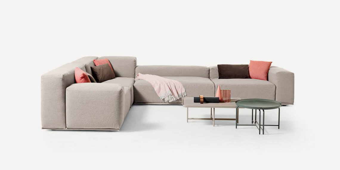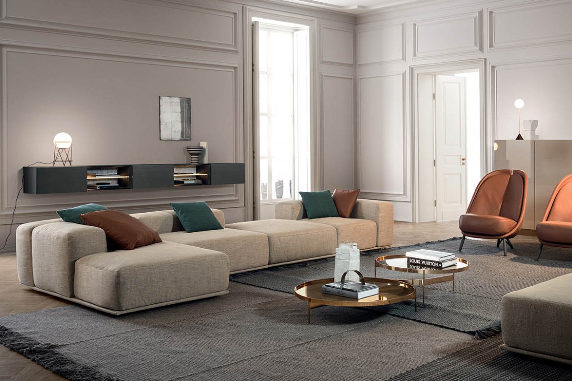 Dive into relaxation: cosy and generous, Delano’s soft, feather-filled seat is irresistible. Inviting and sophisticated, its design looks perfect in the middle of any room. Lots of modular arrangements are available, furnishing spaces in total freedom to utterly enjoy the pleasure of conviviality. There are two different backrest heights as well as two seat cushion depths that can be combined in creative configurations to which low shelving units can be added as armrests. All the volumes stand on covered bases.
