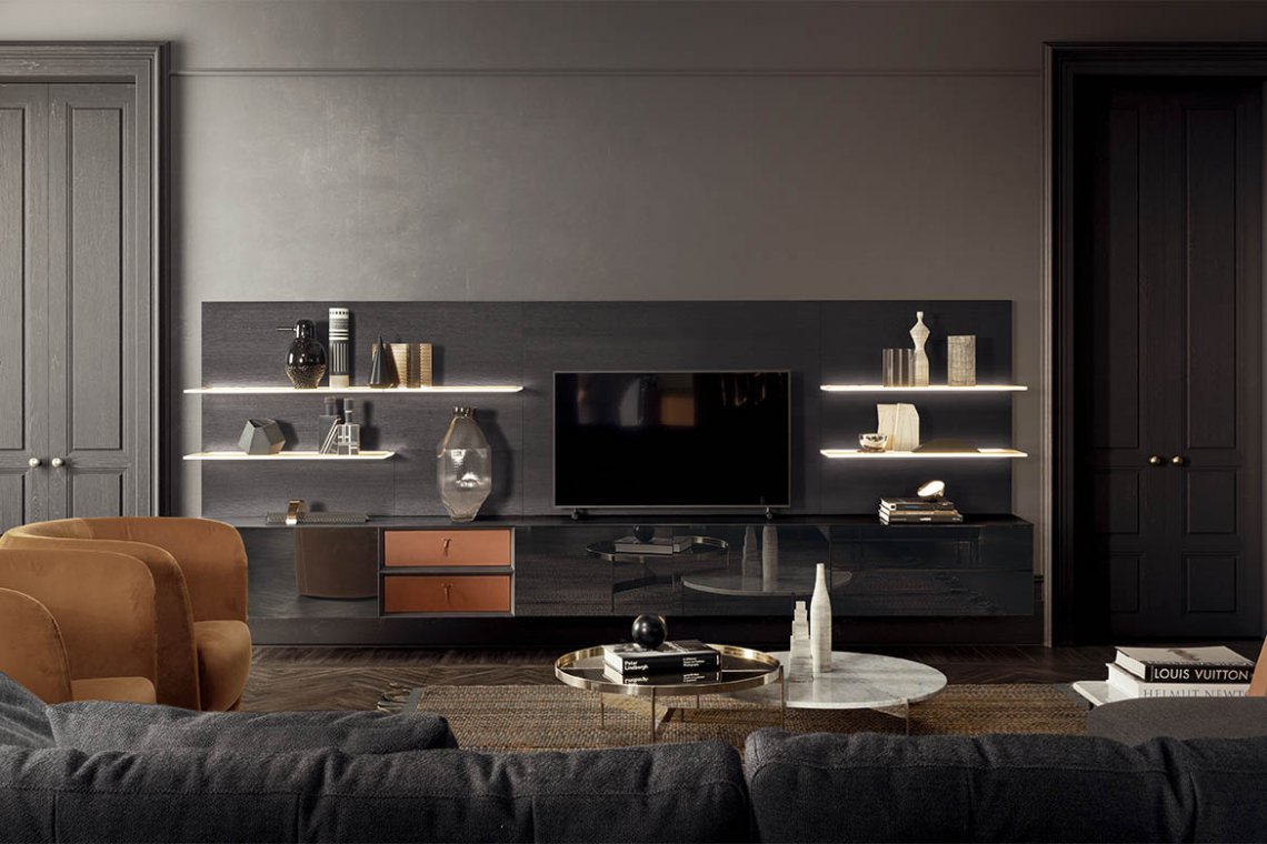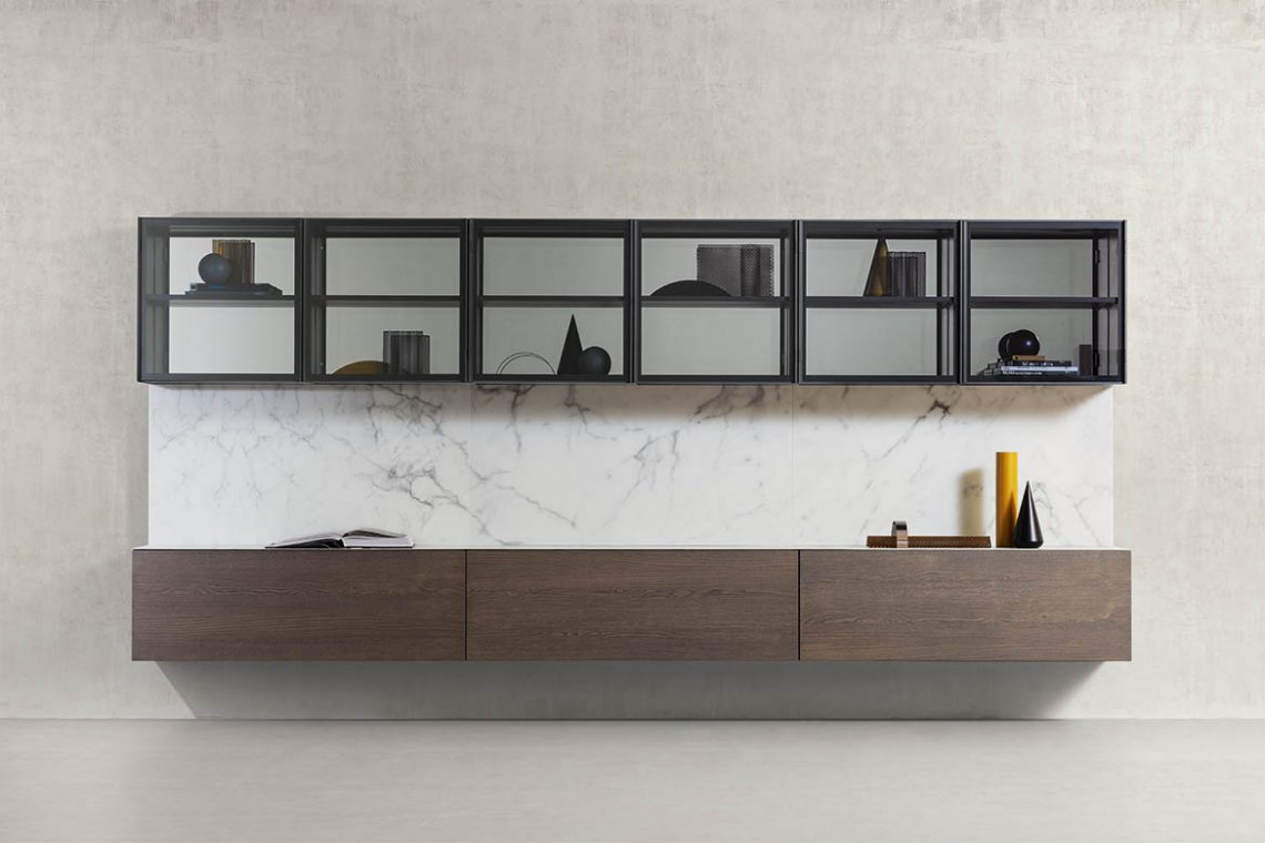 Simplifying everyday movements, creating contours that command order and harmony: Spazio is the very essence of functionality. With close attention to details and a love of textures, it offers a range of modules, sizes and finishes unrivalled in their variety and flexibility. Spazio is ideal for every room in the home and has something to satisfy the tastes and requirements of everyone. The latest additions include marbled glass, mirror glass, backlit shelves, back panels in materico marble, new metal finishes for handles and the luxurious leather model.