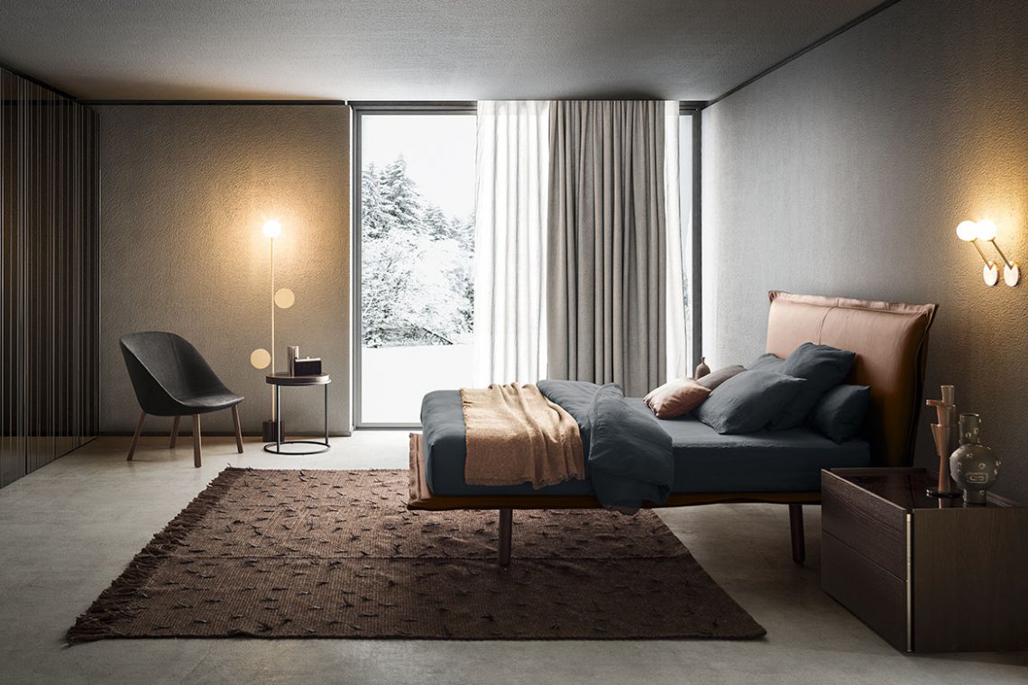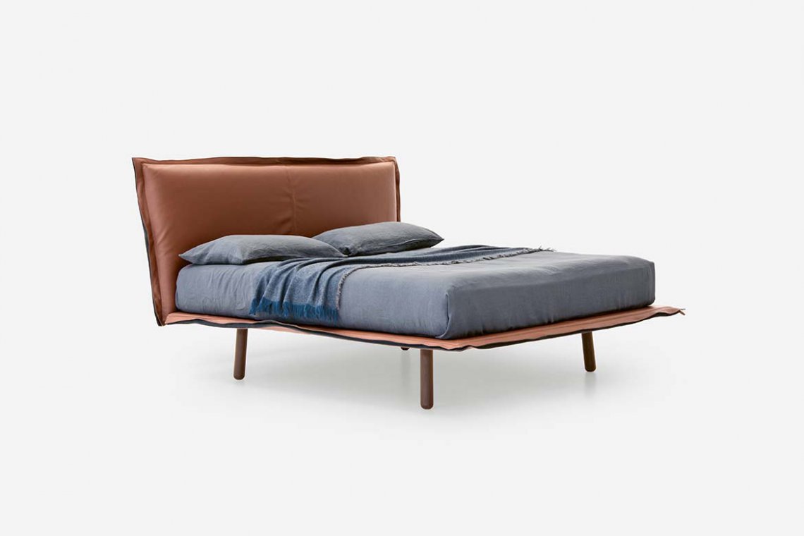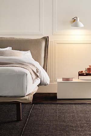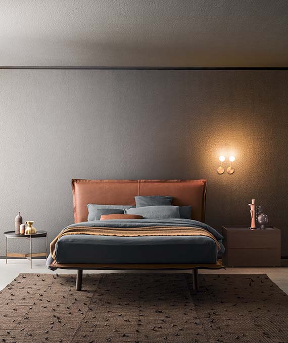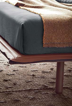Touch of enchantment and magical charm expresses itself through sophisticated details. The soft, light lines of this design are reminiscent of a magic carpet. The edging – whose seam allowance is available in a customised, dual-coloured finish – creates a sinuous wave all around the bed. As desired, the bed base and headboard can be padded and upholstered in fabric, leather or man-made leather.