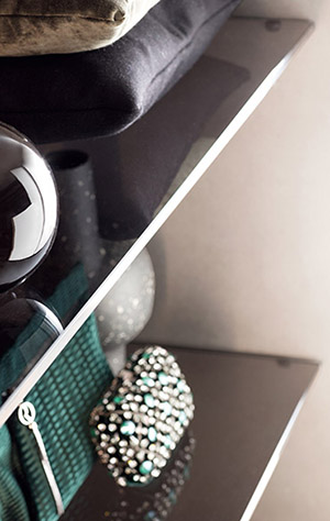 A refined design with a stylish, eccentric appeal. The geometric door decor offers a juxtaposition of gloss and matt glass surfaces. Various-sized rectangles in different proportions stem from a modern artistic language. The handle has a strong graphic impact, cutting across the doors in a horizontal line that enhances the beauty of the composition. Available matt lacquered or in wood, it is recessed inside the panel of sliding or flush sliding doors.