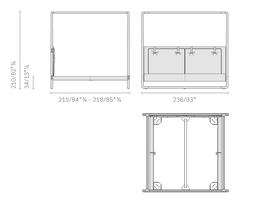 Volare床采用天蓬床結(jié)構(gòu),使用三角形截面摩卡色梣木實(shí)木,向上呈楔形,逐漸變細(xì)變輕。床腳板和縱向床梁使用北美鵝掌楸,完全覆蓋Cuoio Saddle Extra皮革或Pelle Frau?軟皮,床頭使用相同覆層,其結(jié)構(gòu)使用櫸木實(shí)木,內(nèi)部橫撐使用樺木膠合板,墊有梅索奈特板。兩個(gè)豐富而松軟的靠墊,填充聚酯棉,通過兩條皮革或軟皮帶連接在床頭上。床頭前側(cè),皮帶穿過槍管色表面處理金屬孔眼,通過扣子固定在后側(cè),扣子也使用槍管色表面處理,并配有Poltrona Frau標(biāo)志。覆層使用Pelle Frau?軟皮,也可選擇雙色,或使用面料,飾以軟皮或皮革周邊滾邊。