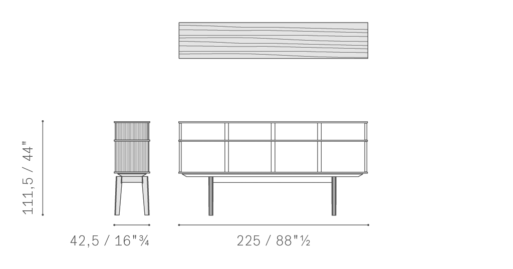 格柵在層壓HPL倍耐板水平元素上滑動(dòng),盡管這種材料極薄,依然能夠保持穩(wěn)定性和堅(jiān)固性,其上還貼有啞光汞表面處理天然橡木片。皮革垂直支柱互相之間距離規(guī)則,帶來節(jié)奏感,彰顯自由的格柵組合。每一個(gè)格柵都是一件小巧的木工作品。以橡木實(shí)木為材質(zhì),沿隔層內(nèi)刻軌道移動(dòng),配有塑料“滑座”,減少摩擦。橡木實(shí)木片切割厚度各不相同,之后手工逐一粘合。置物架側(cè)面以固定式橡木實(shí)木格柵封閉。Lloyd收納柜和書柜分為兩款:沿墻壁擺放或置于房間中央。后一版本兩側(cè)(前側(cè)和后側(cè))均具有滑動(dòng)格柵。沿墻壁擺放的版本則僅在前側(cè)配有滑動(dòng)格柵,與墻壁接觸的后側(cè)使用啞光黑色噴漆中密度纖維板封閉,內(nèi)表面(底板)可以覆蓋皮革。Lloyd書柜和收納柜支腳使用鋼材制成。外側(cè)和前側(cè)支腳使用啞光槍管色噴漆,中央支腳略微靠后,采用啞光黑色漆繪。
