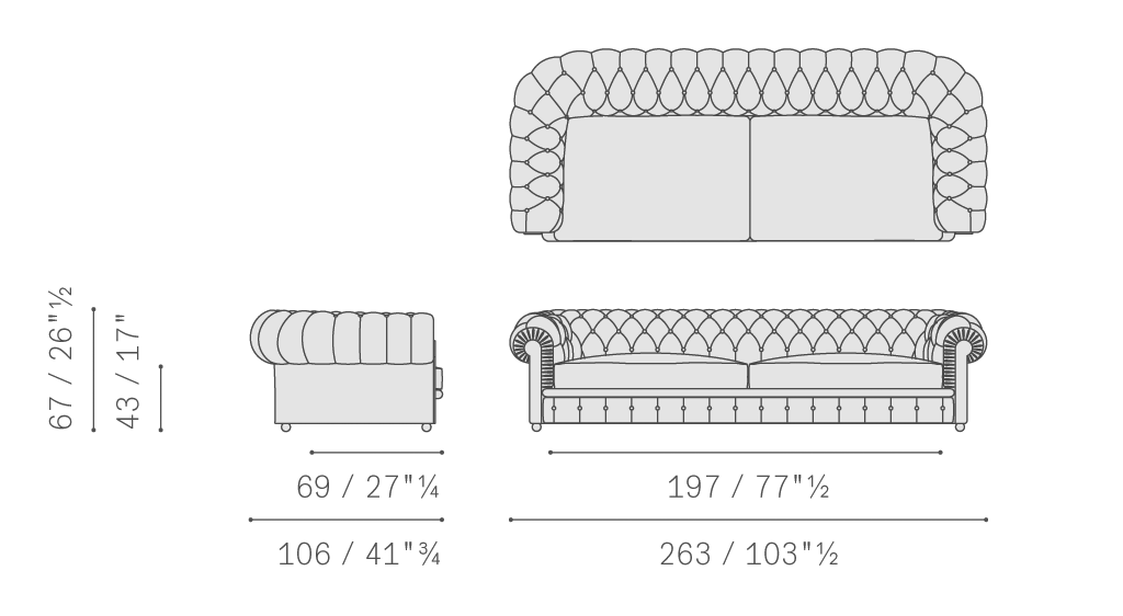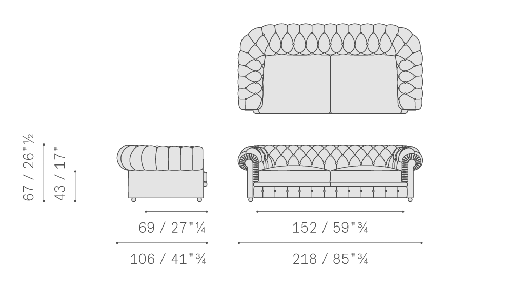 支撐結(jié)構(gòu)采用陳年櫸木。靠背和扶手包墊填充手工塑形的植物纖維。彈簧結(jié)構(gòu)使用手編雙錐形彈簧,固定在黃麻帶上。坐墊填充鵝絨和聚氨酯泡沫。支腳可以是球形,采用黑色漆繪木或胡桃木染色,或者為高腳形,采用相同表面處理或覆蓋軟皮。