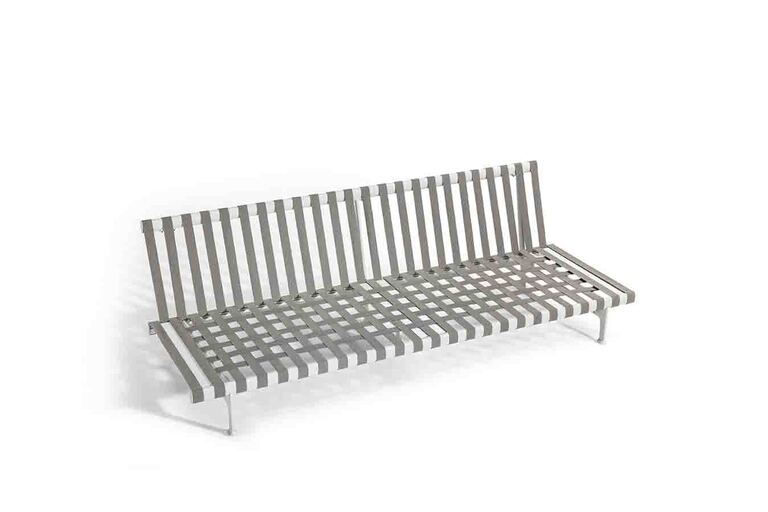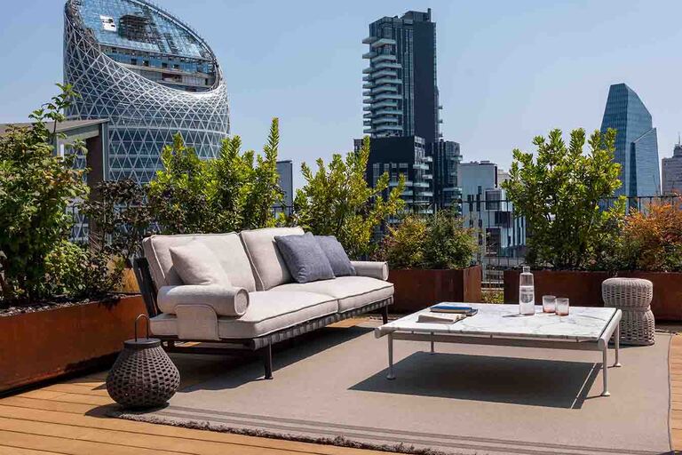 Generously sized, it features a simple design that interprets two archetypes of outdoor furniture: metal and woven belts. The polypropylene fibre elastic belts punctuate the surface of the seat and backrest with full and empty spaces, creating an image of lightness and transparency. That lightness is also emphasised by the cast aluminium support feet, which make the sofa appear as thought it is suspended off the ground. The supporting structure, in extruded aluminium, is made up of three longitudinal beams with an oval section that form an "L", wrapped in the motif created by the belts. The cushions are made up of large "mattresses", emphasised by pronounced piping that draws their silhouette. They are placed directly on the woven structure, without concealing it. The padding is double-density draining polyurethane foam, designed especially for outdoor furnishings.