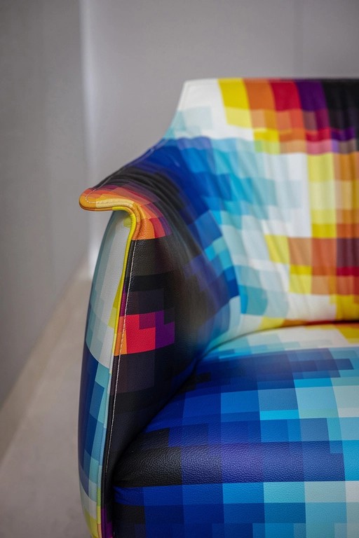 Archibald, designed by Jean-Marie Massaud, is a wide and deep armchair with a steel structure, padded with moulded polyurethane foam and polyester wadding for greater comfort. It is distinguished by the pleasantly textured leather upholstery and the folded armrests that resemble a shirt collar. Thanks to a process of digital printing on the leather, usually reserved for small luxury leather goods, Felipe Pantone's artwork gives the upholstery a nuanced palette of reds, oranges, yellows, whites and blues reminiscent of the hot and cold temperatures of a heat map. The upholstery is in Pelle Frau ColorSphere Impact Less, the innovative leather tanned with sustainable components and without the use of chrome for a reduced environmental impact.