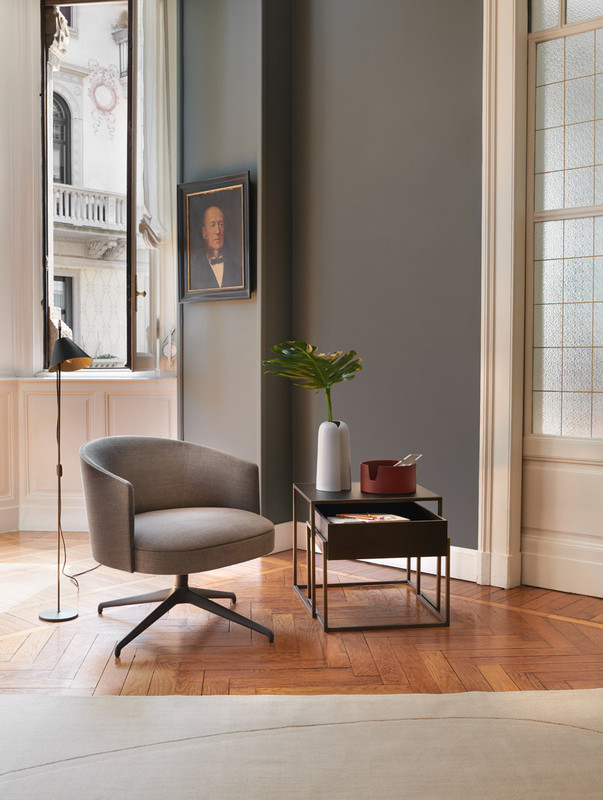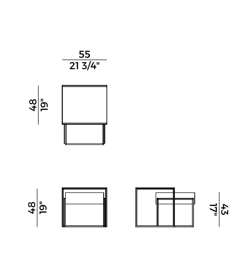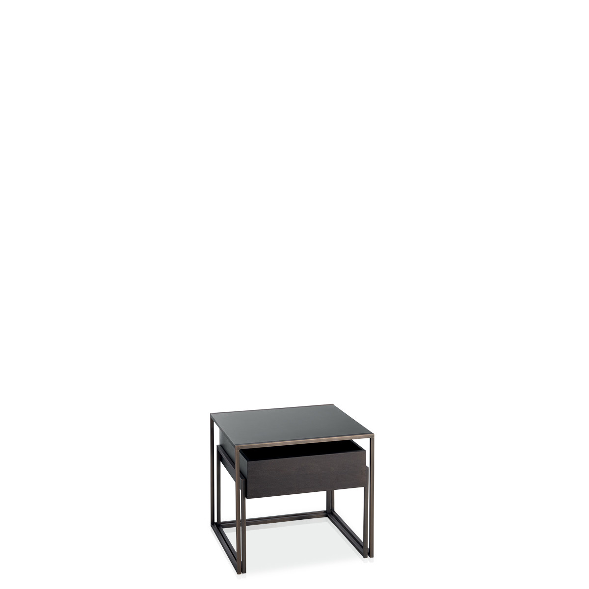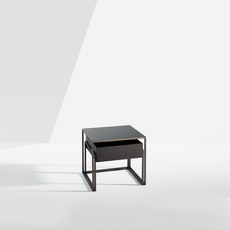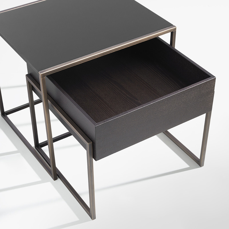Pocket was born from the idea of creating a coffee table in the name of multifunctionality. Its structure is composed of two interlocking coffee tables of different heights: the highest one with metal base and black lacquered top, the lowest with the same metal base and container top in ash wood or Canaletto walnut that can be used as a drawer or top.