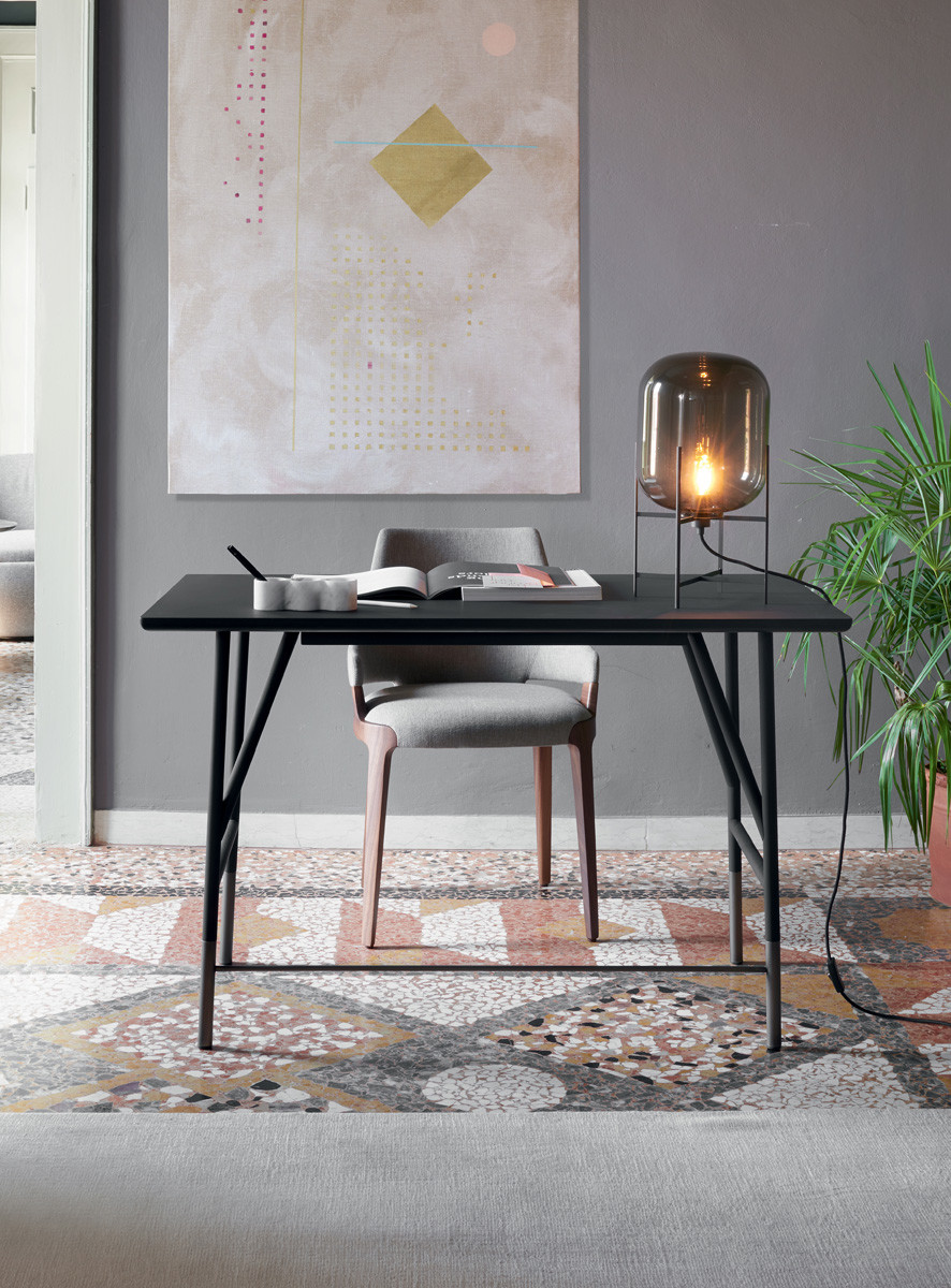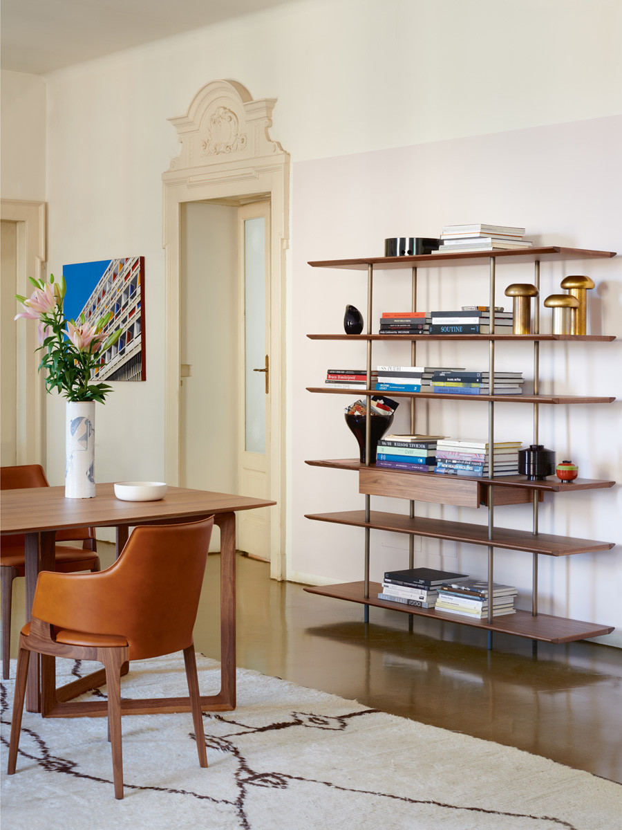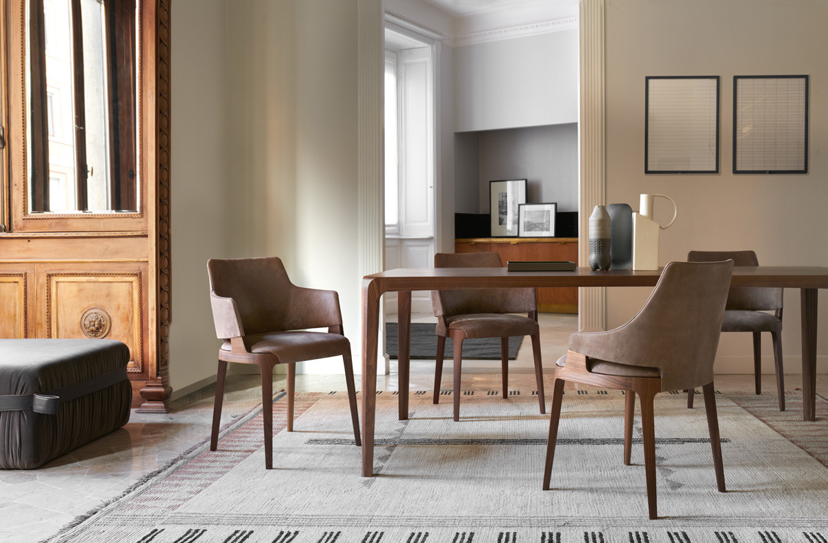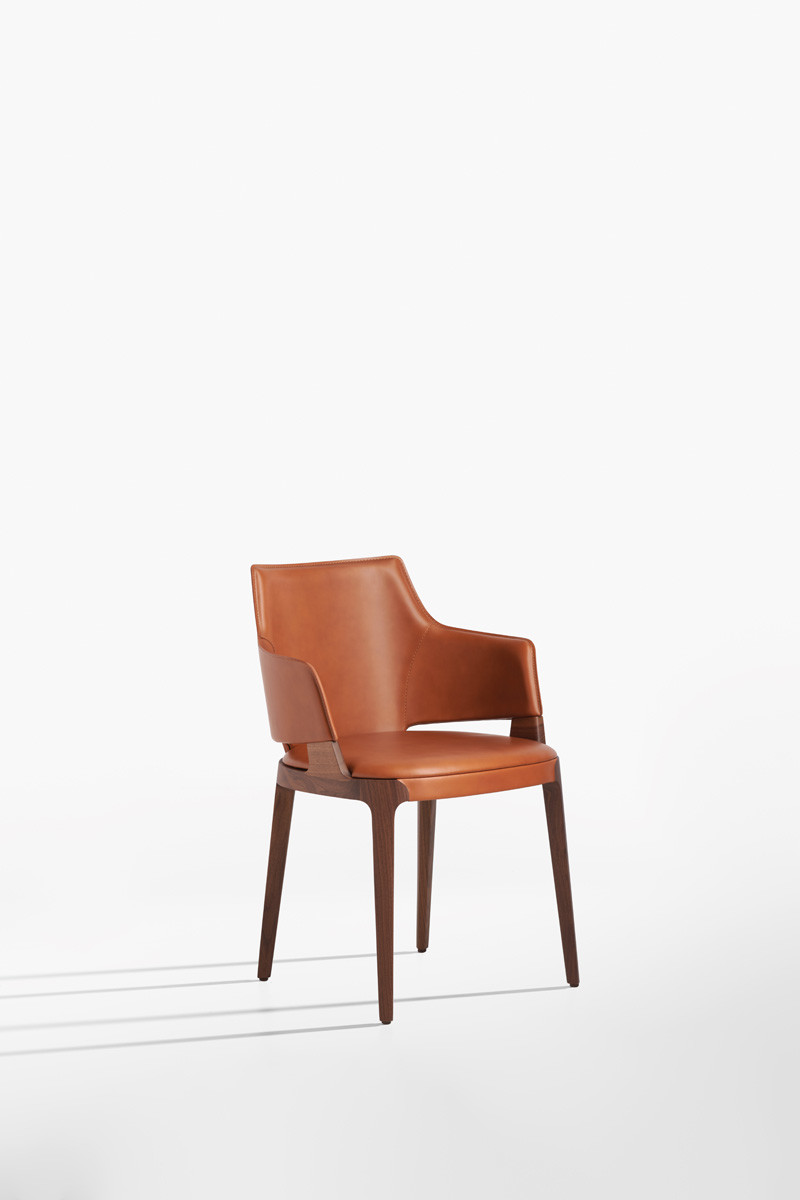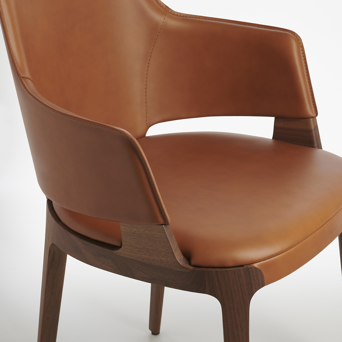 Swivel tub chair with seat and backrest padded in fire retardant polyurethane foam. Seat details in solid ash wood or Canaletto walnut and four-star swivel base in embossed black painted metal. Finishes and coverings as per collection.