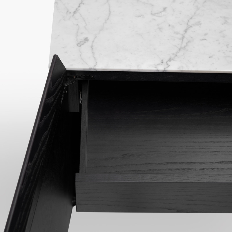 Ash wood or Canaletto walnut case, upper edge of the doors and back in solid ash wood or Canaletto walnut, marble, tempered black back painted glass, ash wood or Canaletto walnut top. Bronzed brass base.