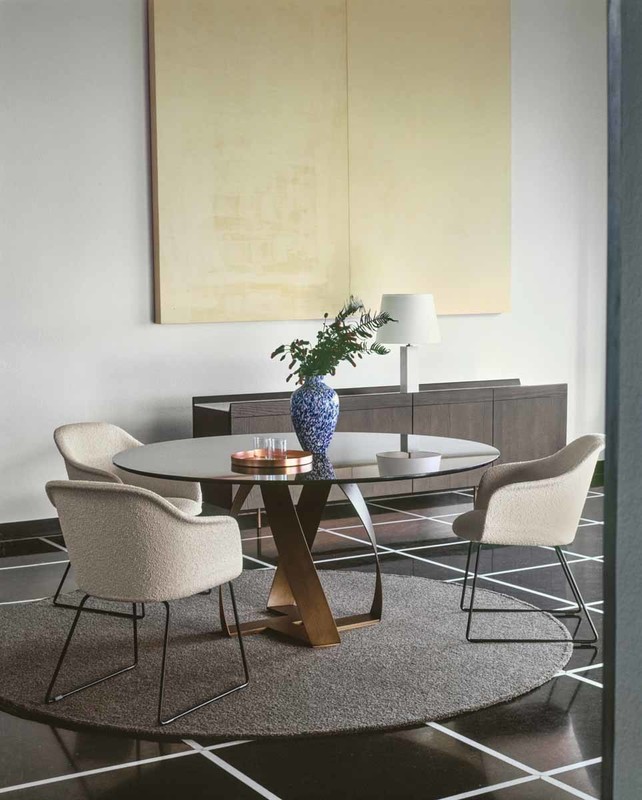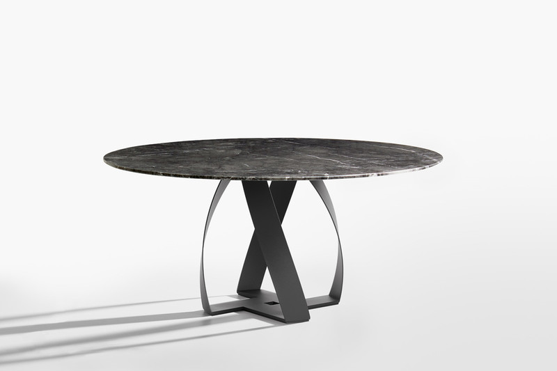 The design with intertwined bands of the metal base is the element that characterizes the Bon Bon tables and coffee tables’ family.