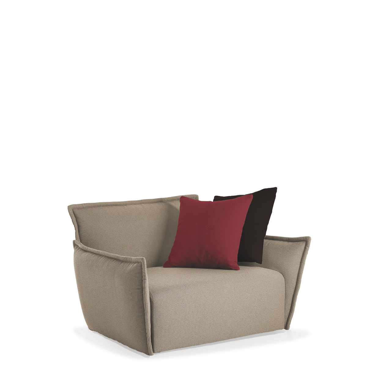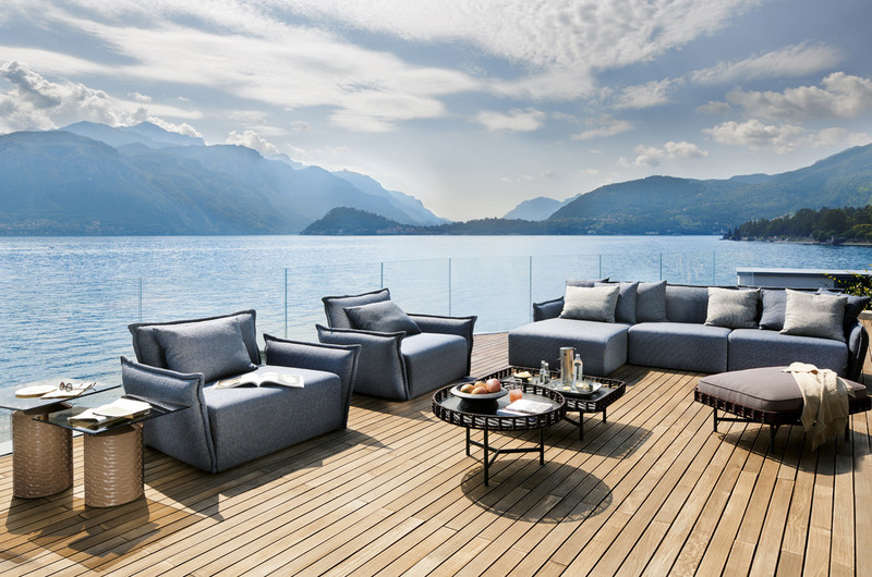 The Purple upholstered family, composed of modular sofas and armchair, is characterized by the soft and curved cushioning with removable outdoor fabric covers, serving as a backrest and seat for the maximum comfort.