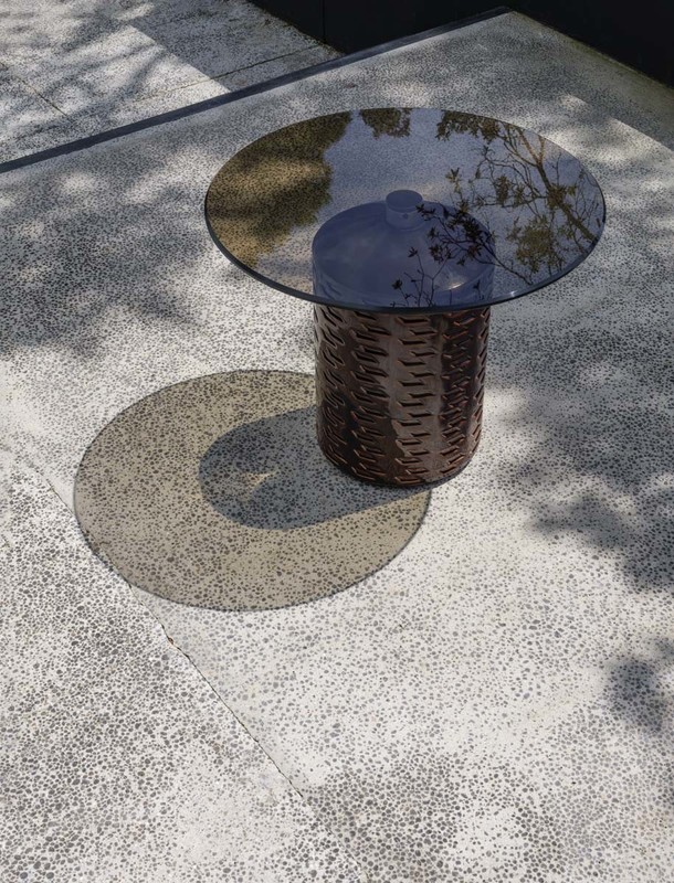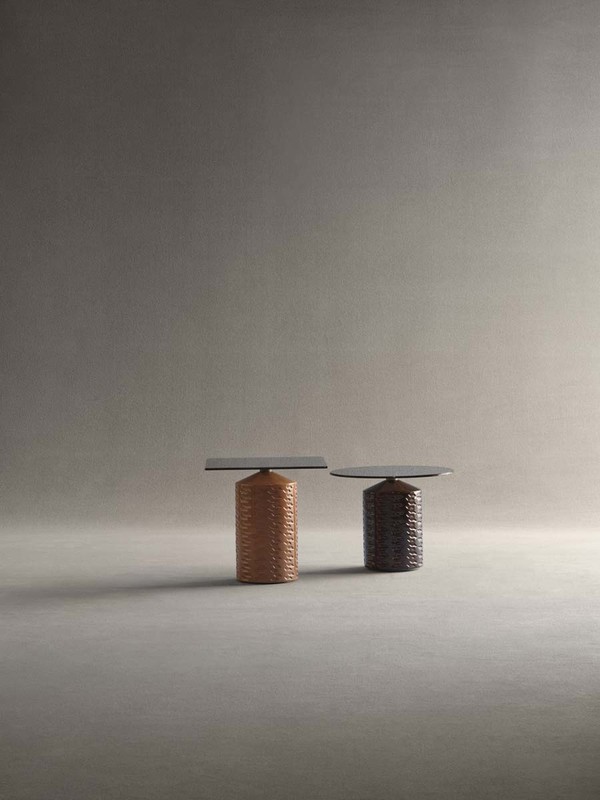 The base in ceramic, presented in the new Chocolate finish, characterized by a handcrafted geometric-patterned bas-relief decoration, which through the deposit of the crystalline creates refined chromatic effects, distinguishes the Hishi coffee tables' family.