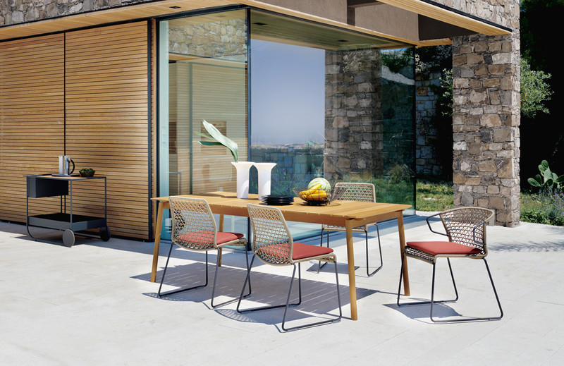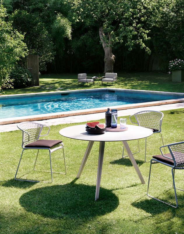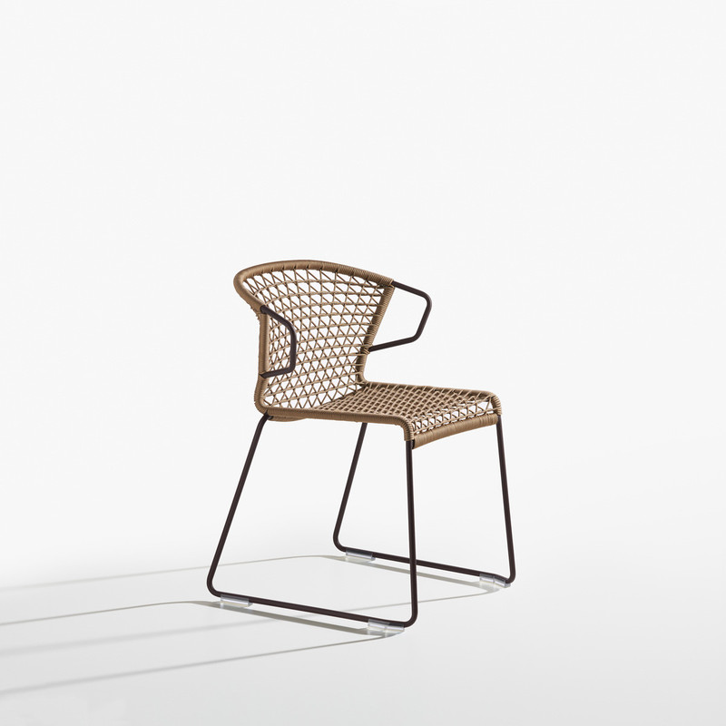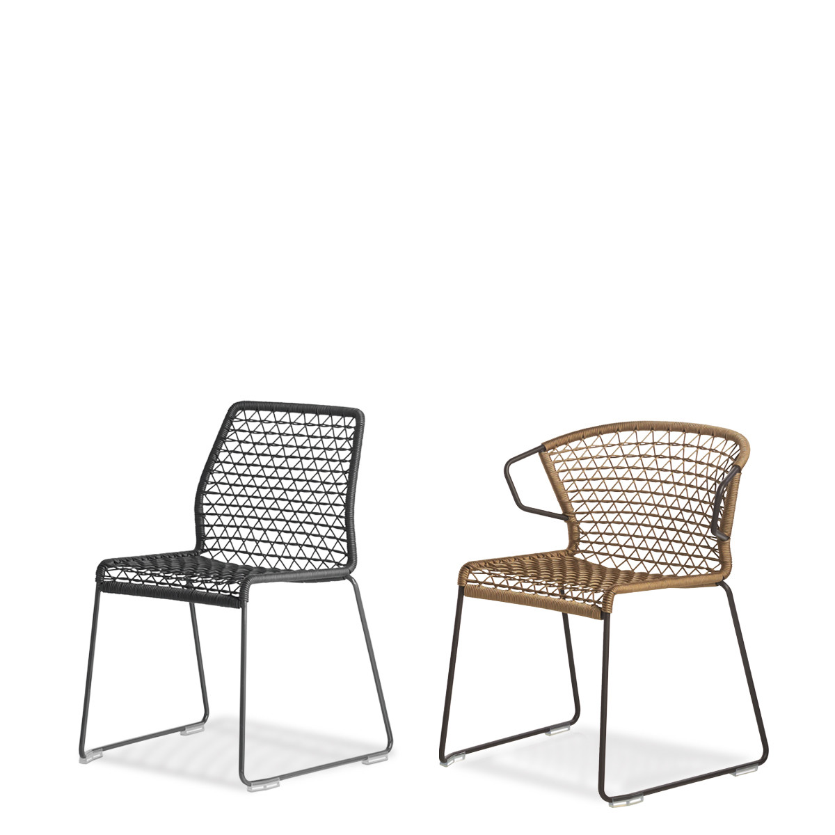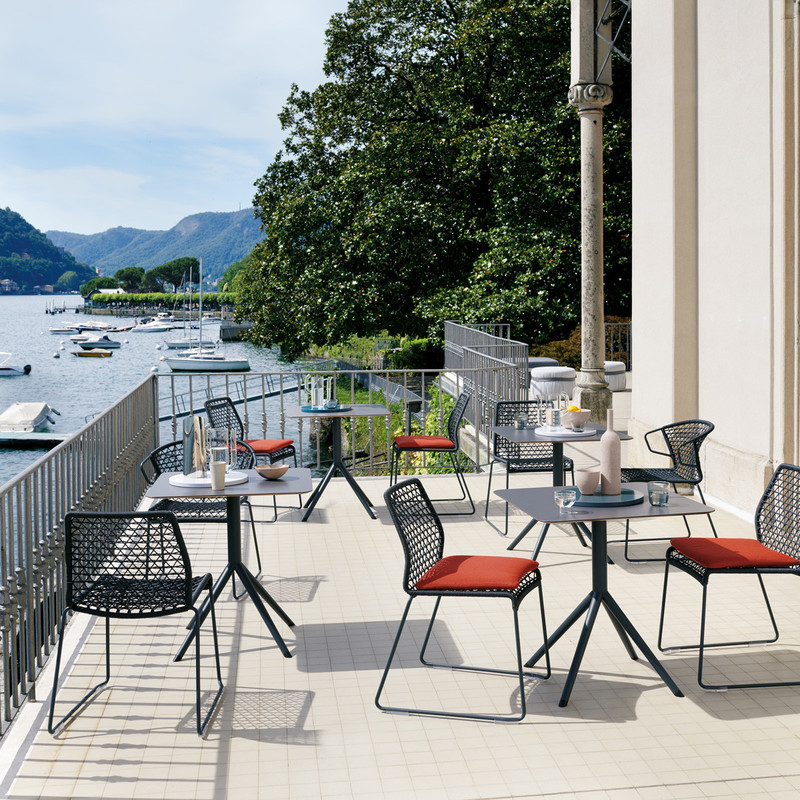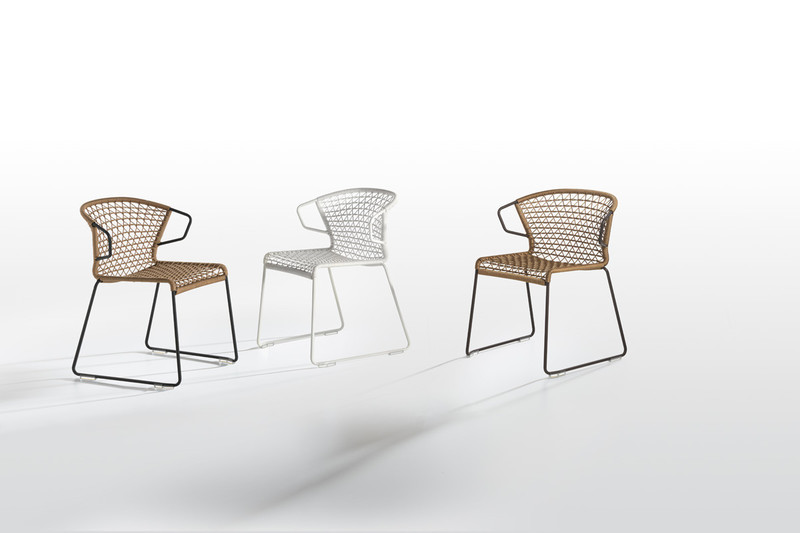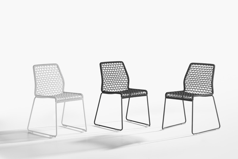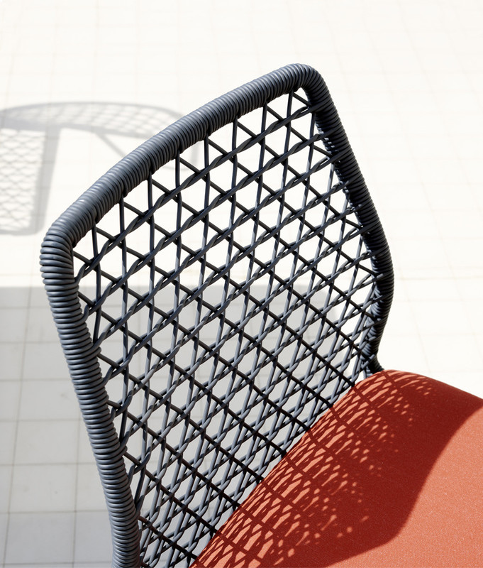 Characterized by a slender frame in painted metal tube with sled-shaped legs, and weaving in nautical or PVC rope, the Vela stools are proposed in two different heights, making them suitable for multiple contexts.