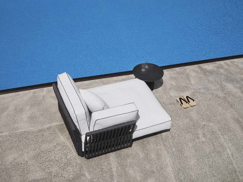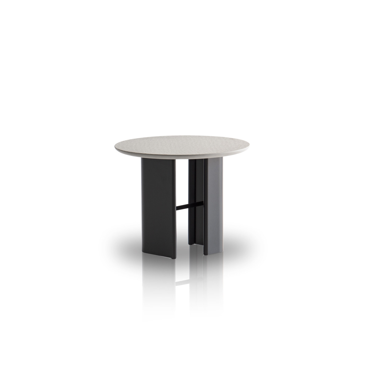 Coffee table with circular top and base in epoxy powder coated steel sheet with black embossed finish.