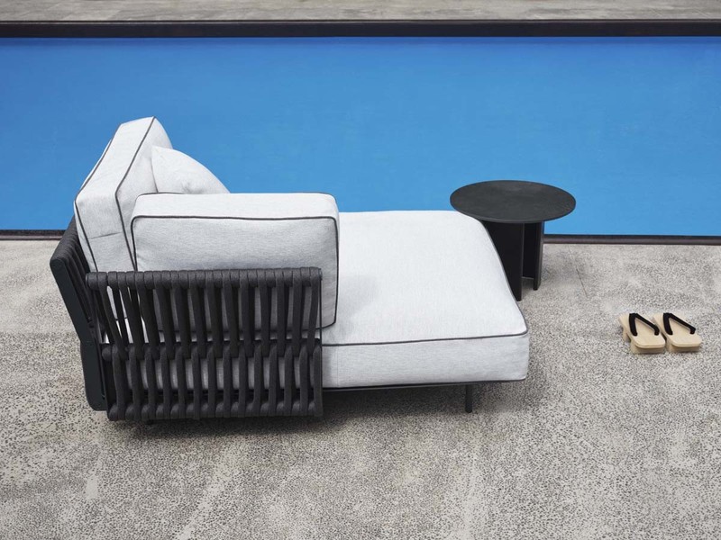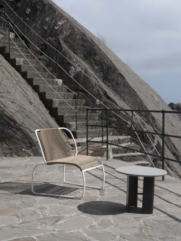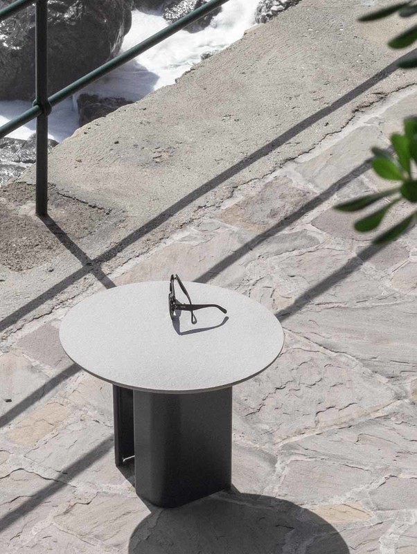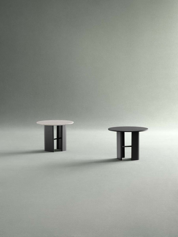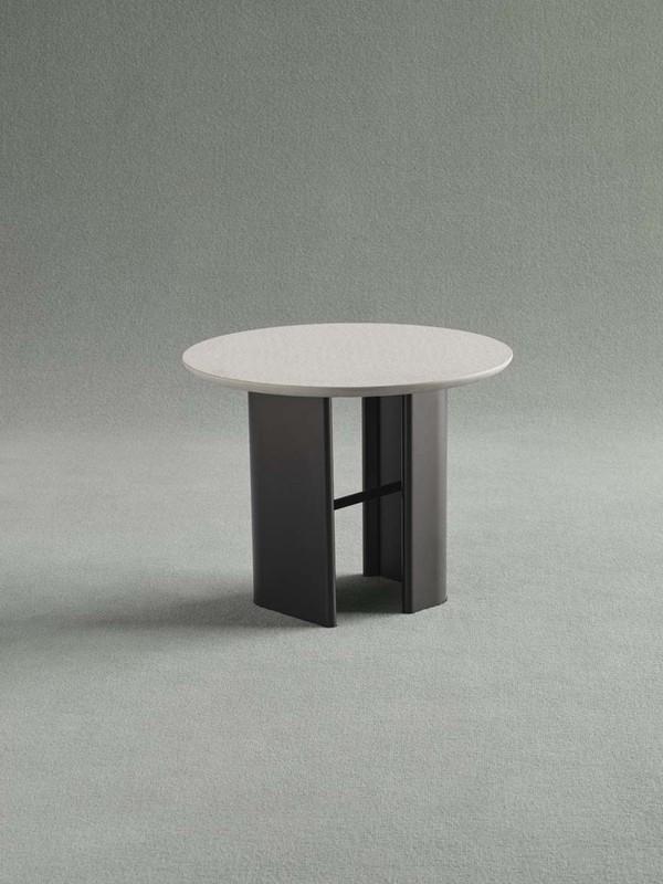 Connection between the bases in painted black metal and top in laminated porcelain or in light grey natural stone.