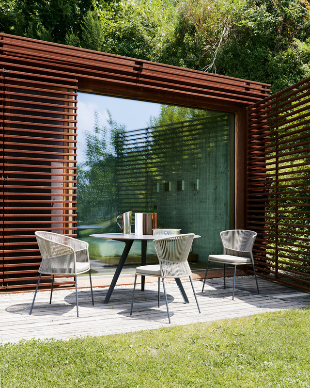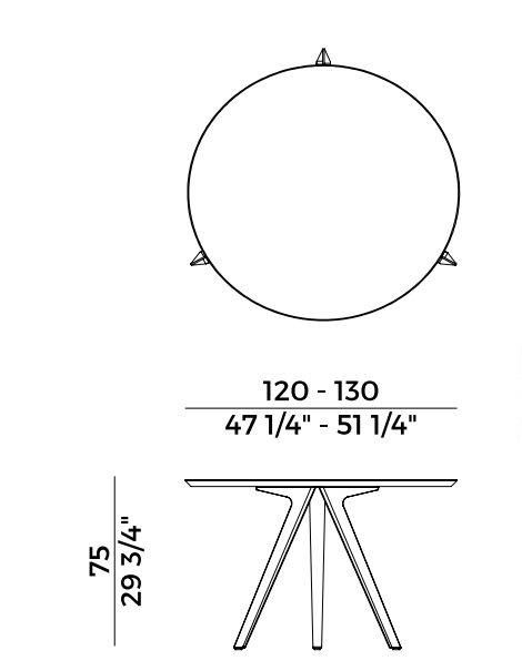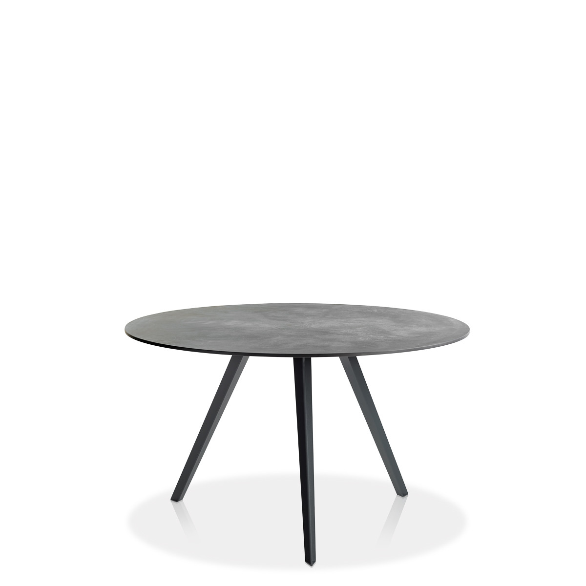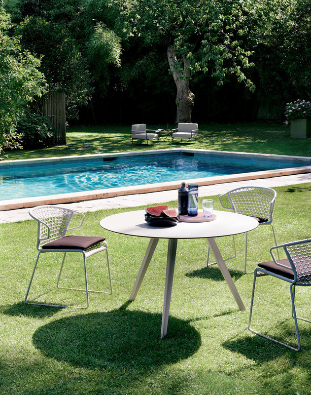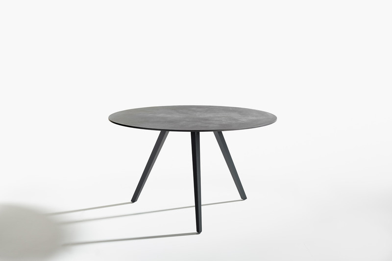 Katana is a table designed to adapt to both domestic interiors and open-air contexts, proposed in a version with three legs in embossed painted metal and a ?120 e ?130 cm round top in laminated porcelain or HPL, in the finishes as per collection.