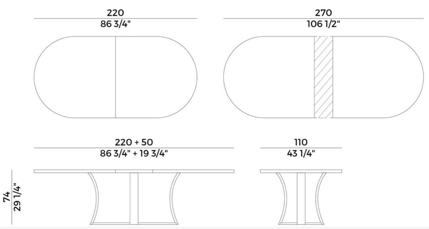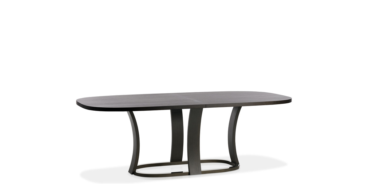 Grace is a table with oval top with central extension and brushed ash structure, in the finishes as per collection, with ruthenium metal protection ring.