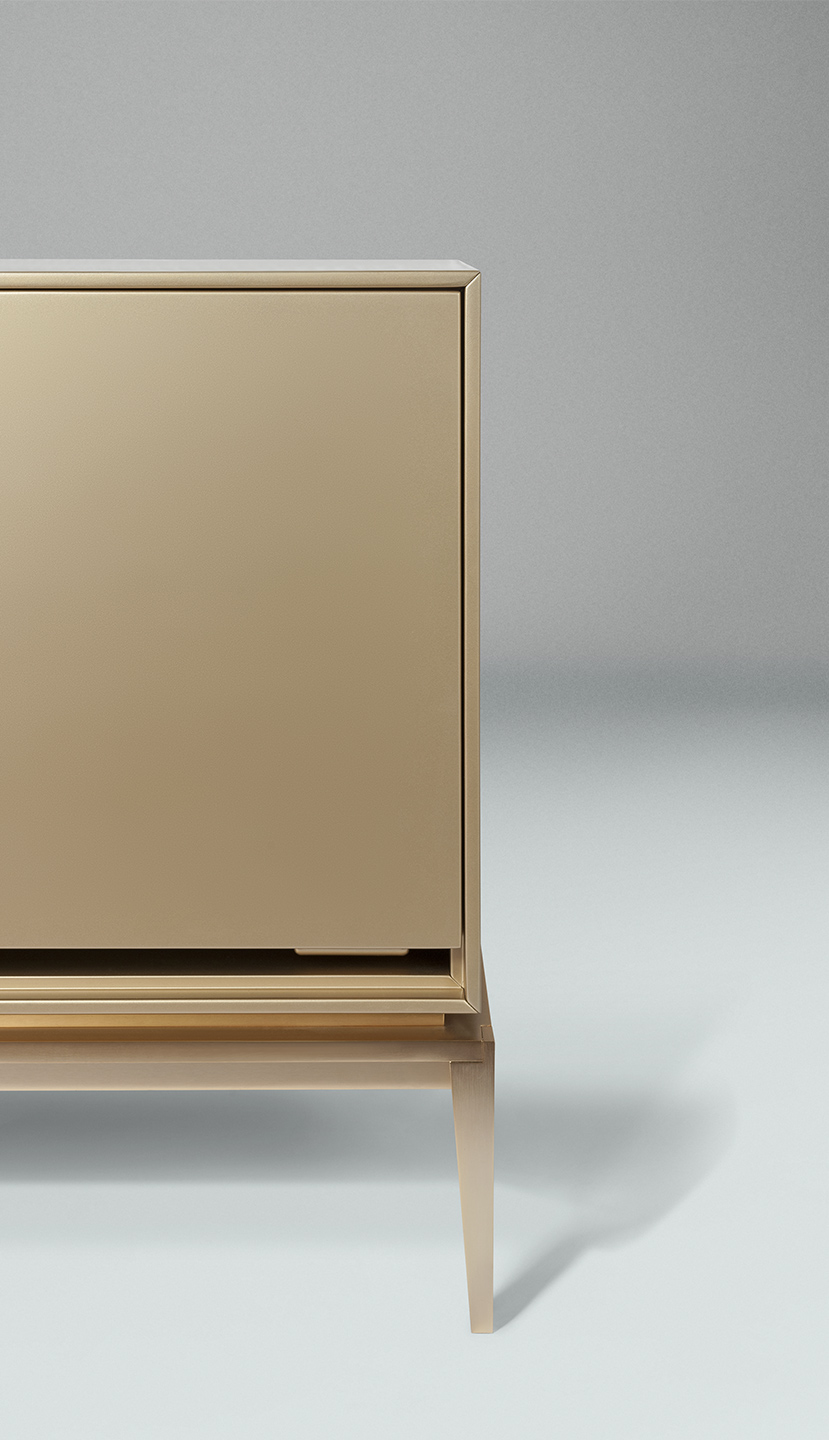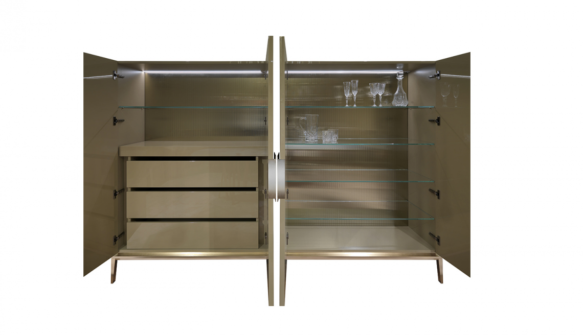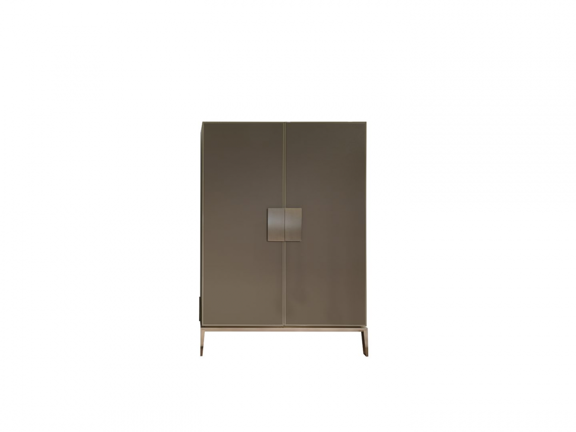 L’interno si presenta laccato opaco in tinta, con schiena rivestita in vetro specchiato satinato col. bronzo e organizzato con opportuni 4 ripiani in cristallo oppure 3 cassetti, 1 ripiano verniciato lucido 100 gloss e 1 ripiano in cristallo. Luce led interna.