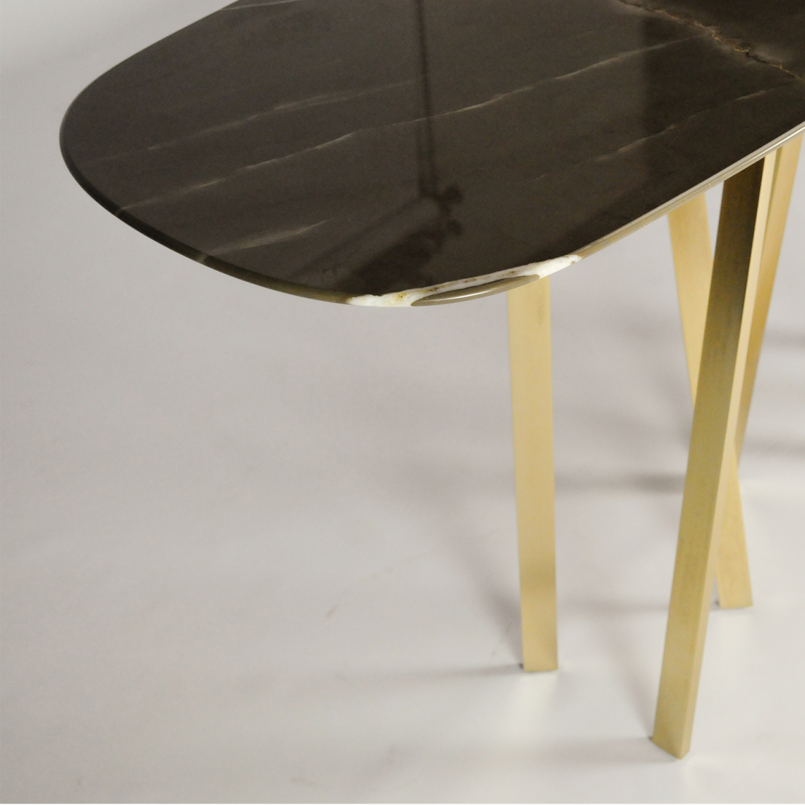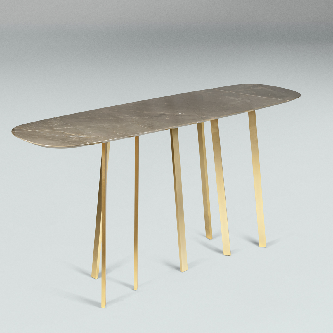 è realizzato con un piano ovale e angoli ad ala di gabbiano in pregiato marmo. La base si compone di 7 gambe in metallo con finitura oro opaco, disposte con diverse inclinazioni e saldate a un disco di fissaggio in metallo che viene fissato al piano tramite viti metalliche. Spessore piano 2cm.