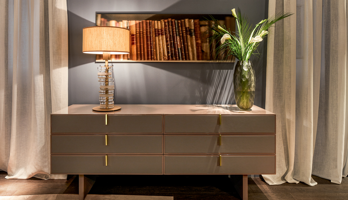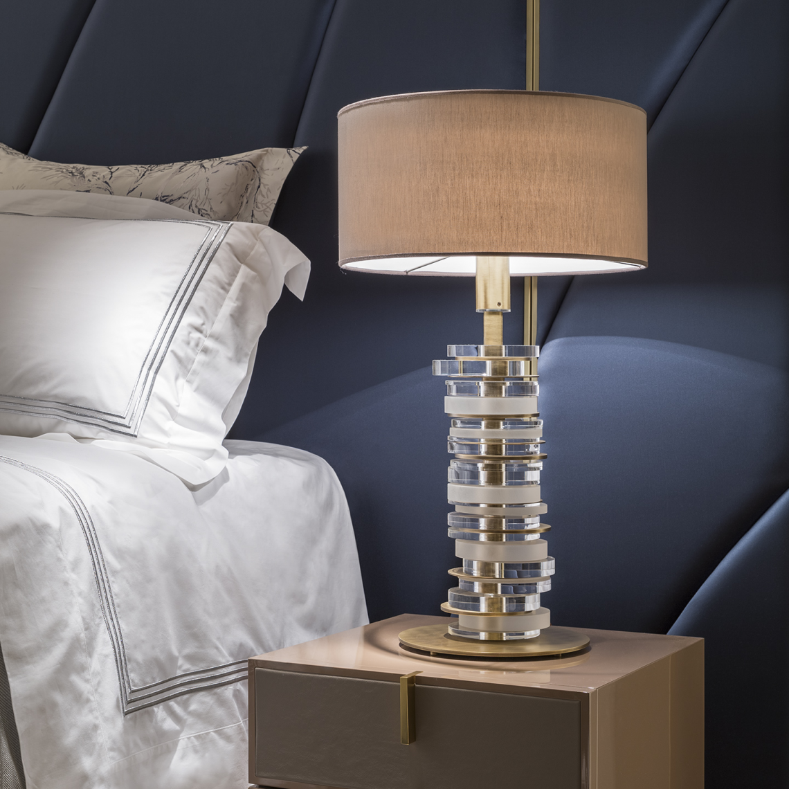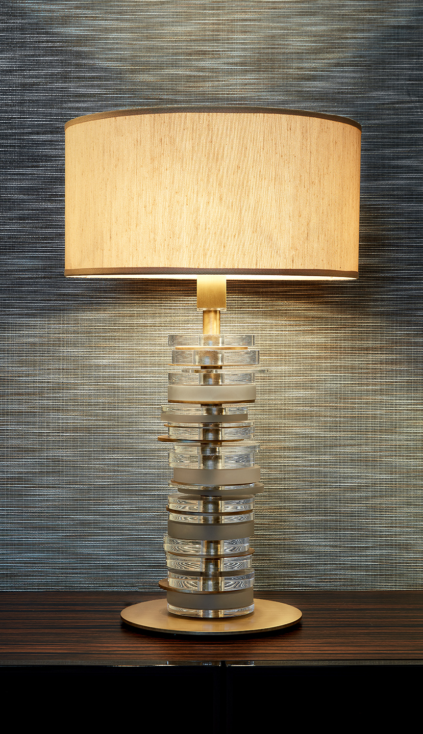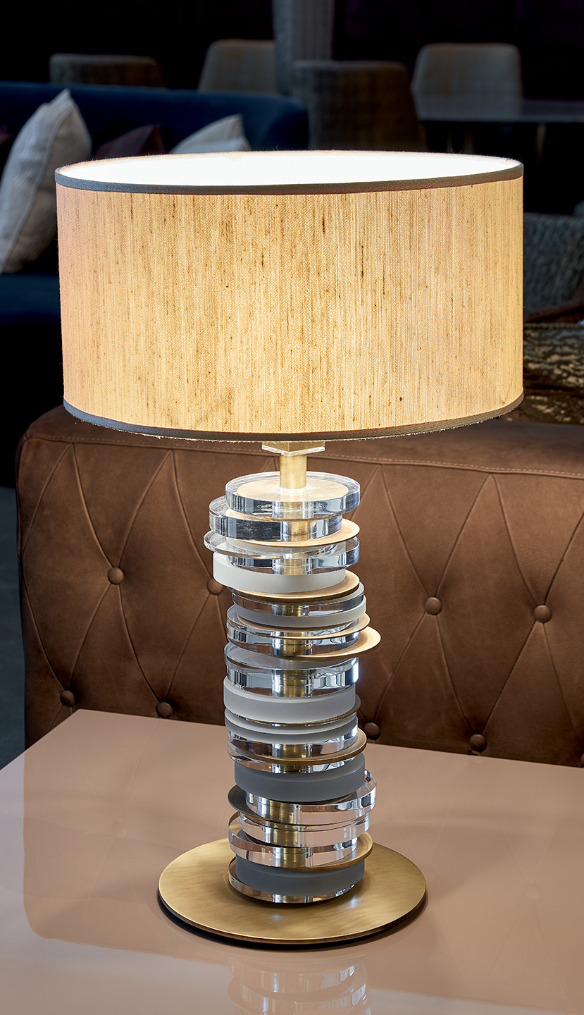 Questa lampada è composta da un’asta in ottone con finitura oro scuro o rutenio nella quale sono inseriti e ruotano dischi in lucite alternati a metallo con trattamento galvanico che creano un sofisticato gioco di trasparenze e riflessi di luci. Ambra è completata nella parte superiore da un prezioso cappello in seta in tono con i metalli.