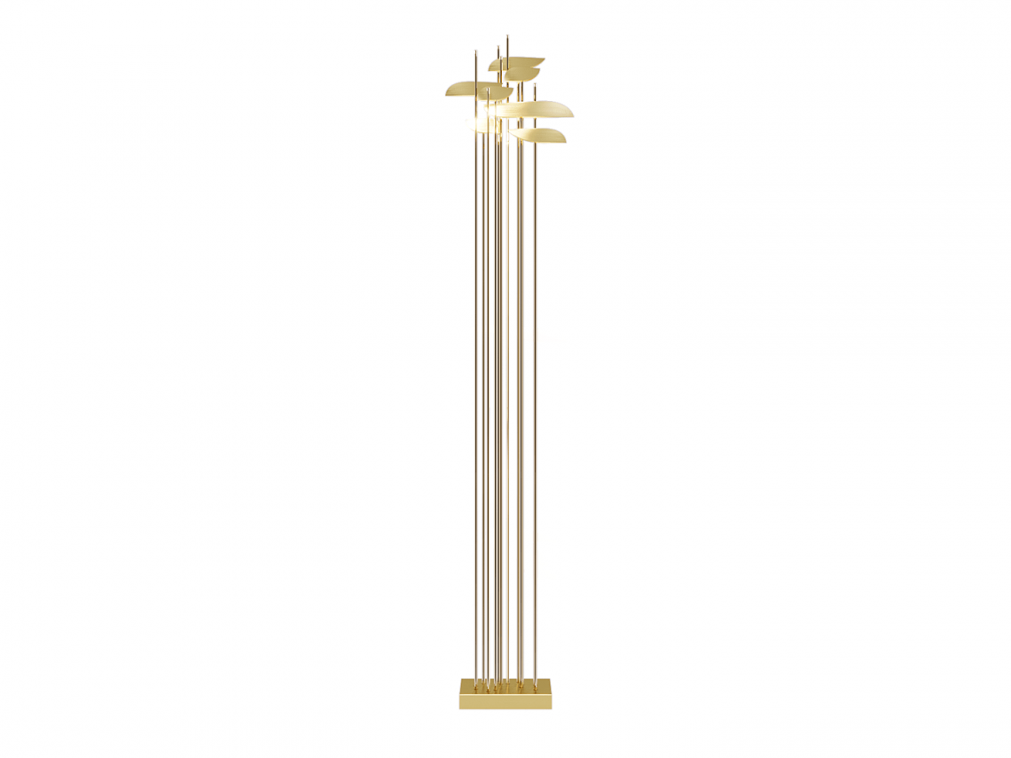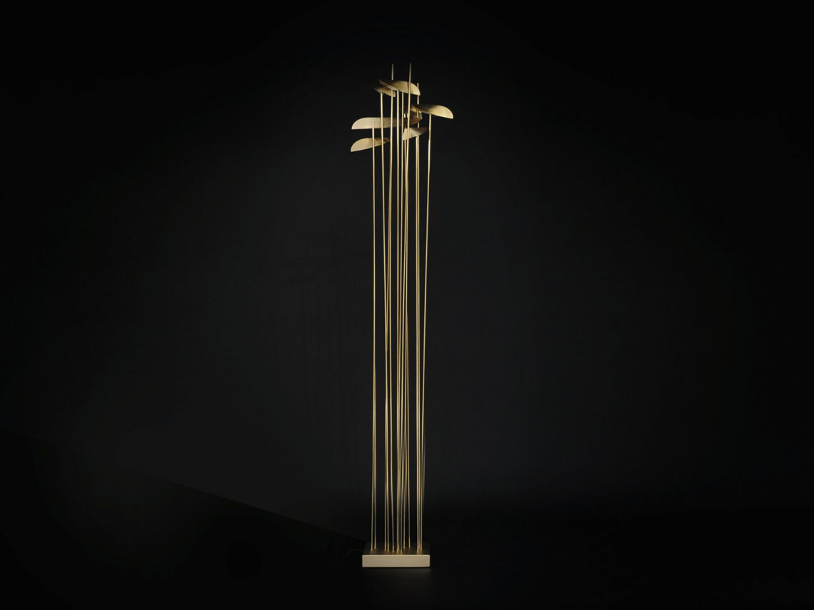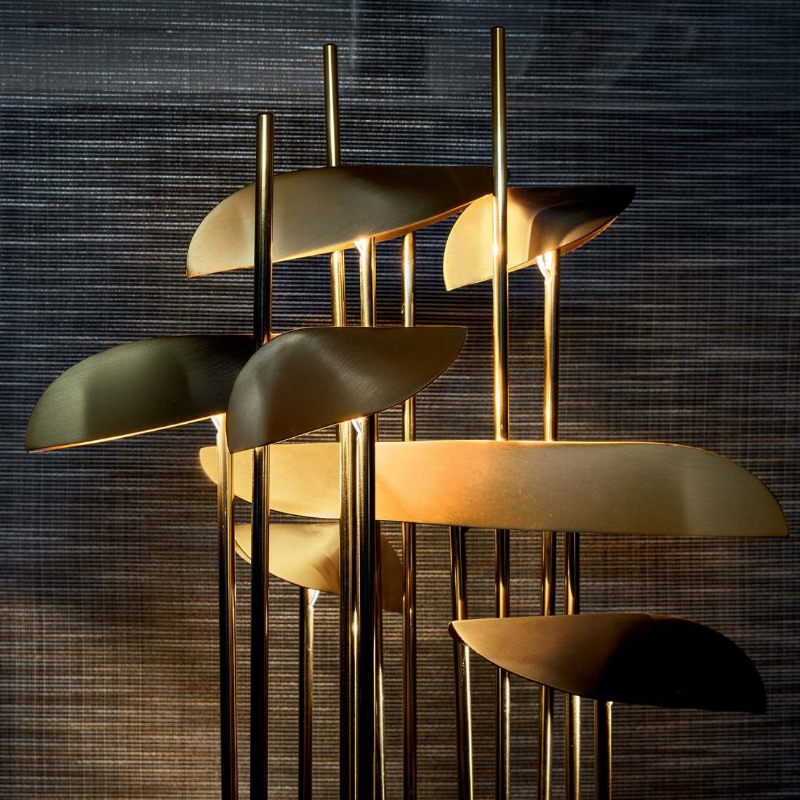è composta da 13 lunghi steli in ottone lucido ancorati ad una base metallica quadrata, alcuni vengono decorati da foglie in metallo realizzate asimmetricamente a mano da esperti artigiani in finitura oro opaco satinato. La base è in finitura oro opaco.Perfetta in coppia per creare la giusta simmetria nello spazio. La preziosità della lavorazione artigianale rende ogni pezzo della collezione unico nel suo genere.