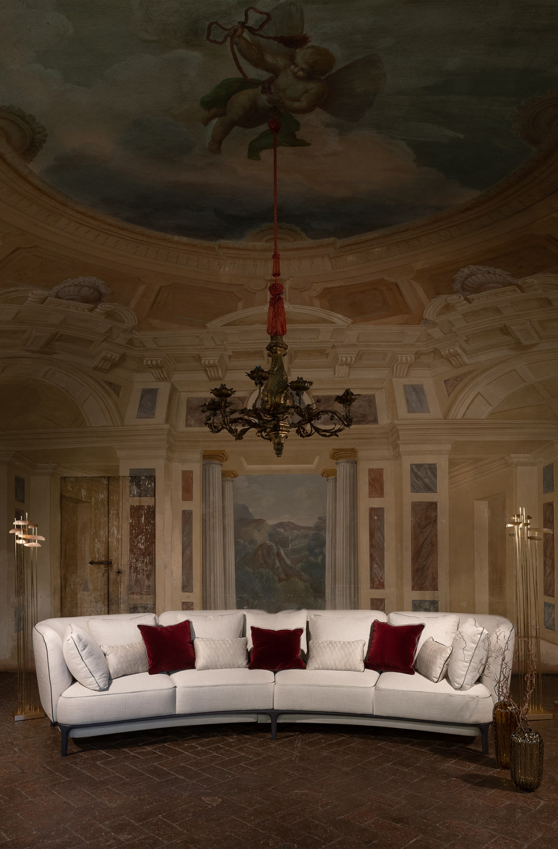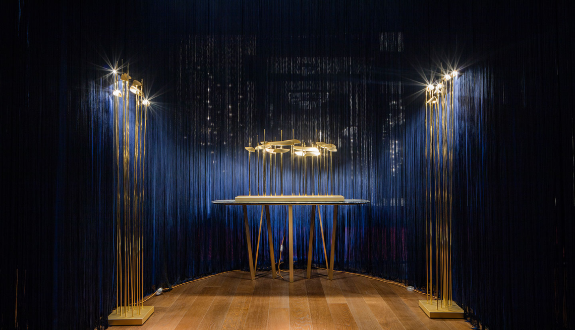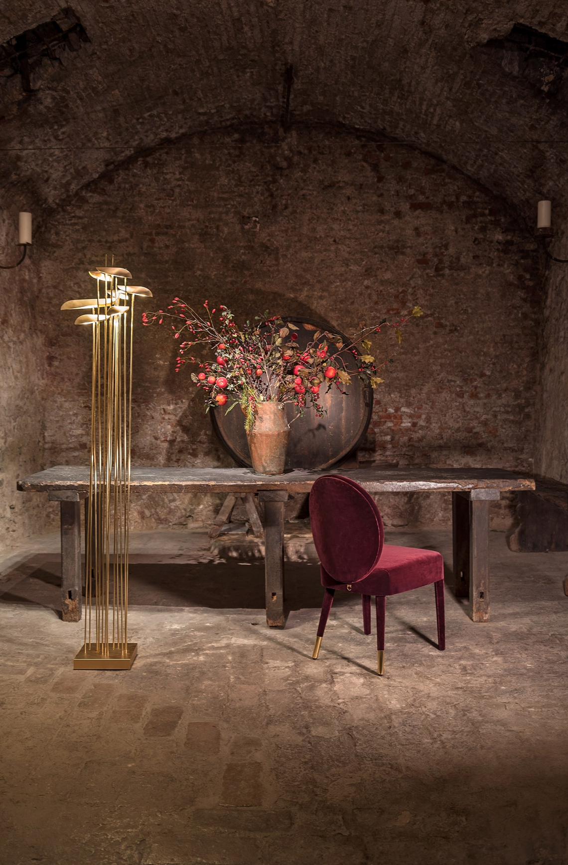 è composta da 13 lunghi steli in ottone lucido ancorati ad una base metallica quadrata, alcuni vengono decorati da foglie in metallo realizzate asimmetricamente a mano da esperti artigiani in finitura oro opaco satinato. La base è in finitura oro opaco.Perfetta in coppia per creare la giusta simmetria nello spazio. La preziosità della lavorazione artigianale rende ogni pezzo della collezione unico nel suo genere.