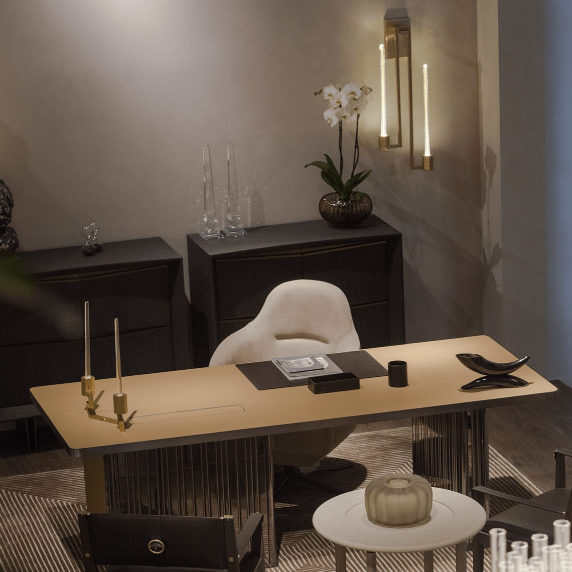 Della linea fa parte anche questa versione applique, realizzata con due bracci in ottone fiitura oro opaco che sorreggono elementi in vetro di Murano con foglia d’oro 24 KT all’interno, in dispersione.