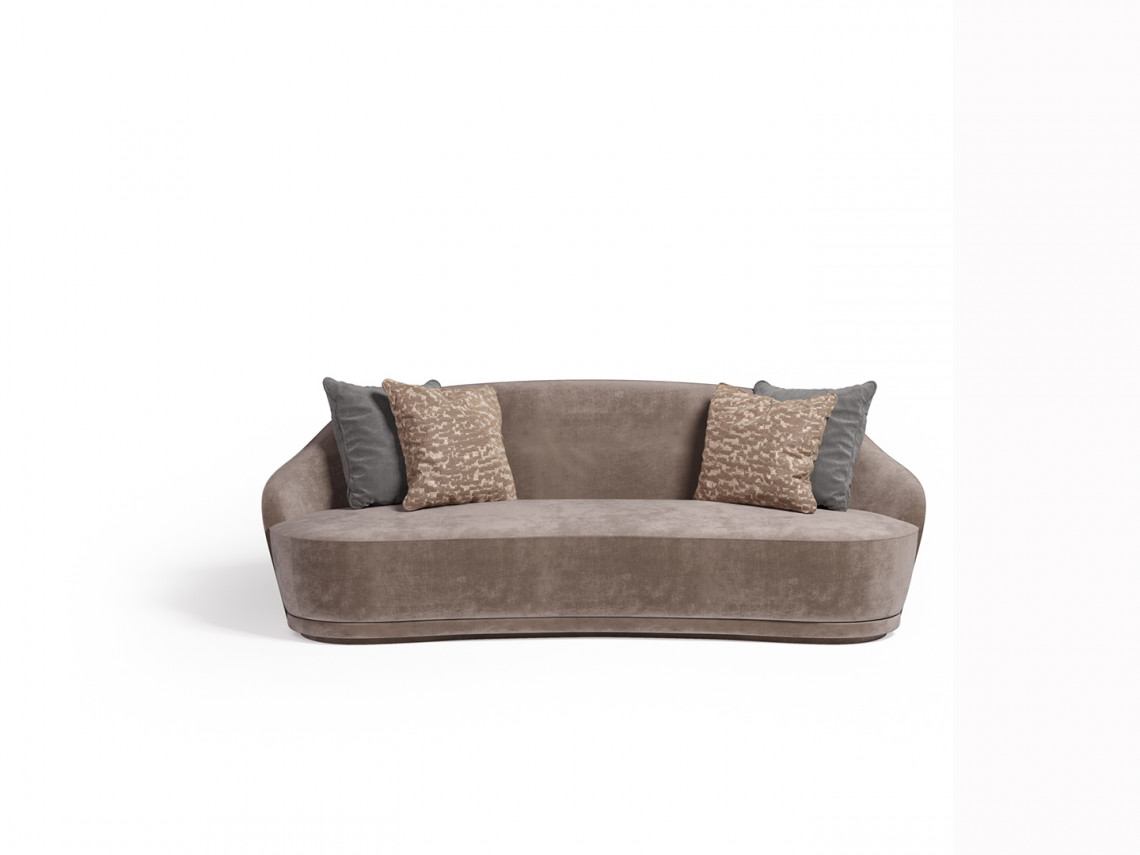 è provvisto di zoccolo in legno rivestito con il medesimo rivestimento. Il rivestimento, non sfoderabile, può essere personalizzato con morbidi velluti e cuscini decorativi. Possibilità di rivestire lo schienale a contrasto. Il rivestimento è realizzato con piping in tinta che impreziosisce ed esalta la linea del divano.
