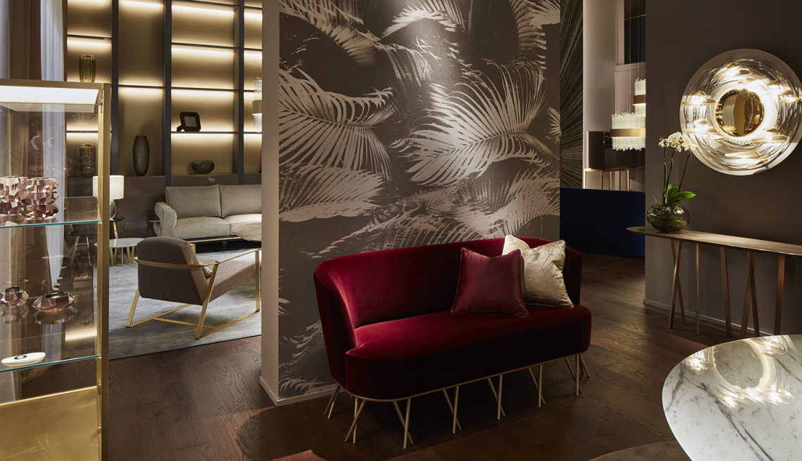 Il divano poggia su di una struttura in metallo con gambe disposte ad incrocio, arricchite con preziosa finitura oro opaco.