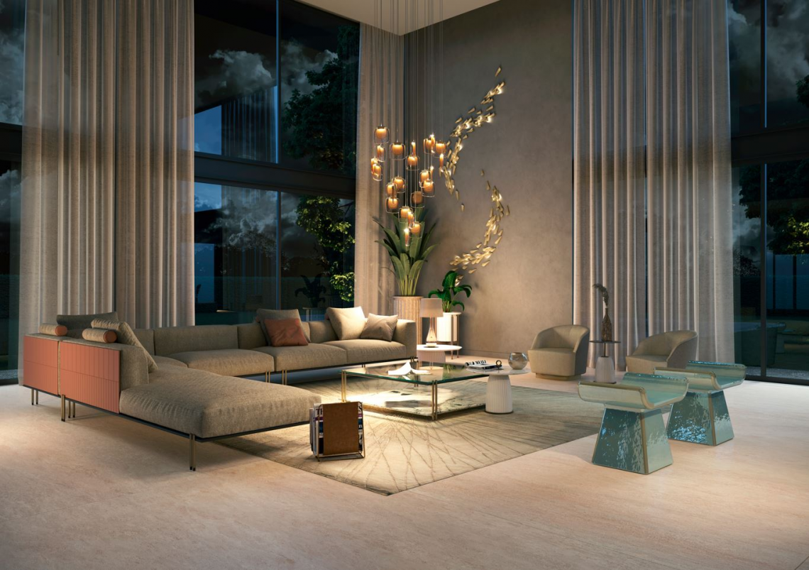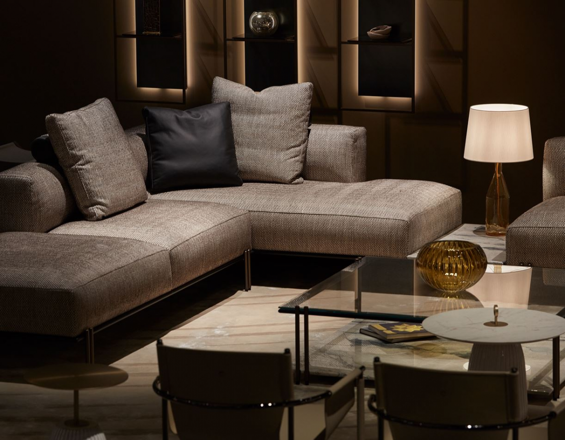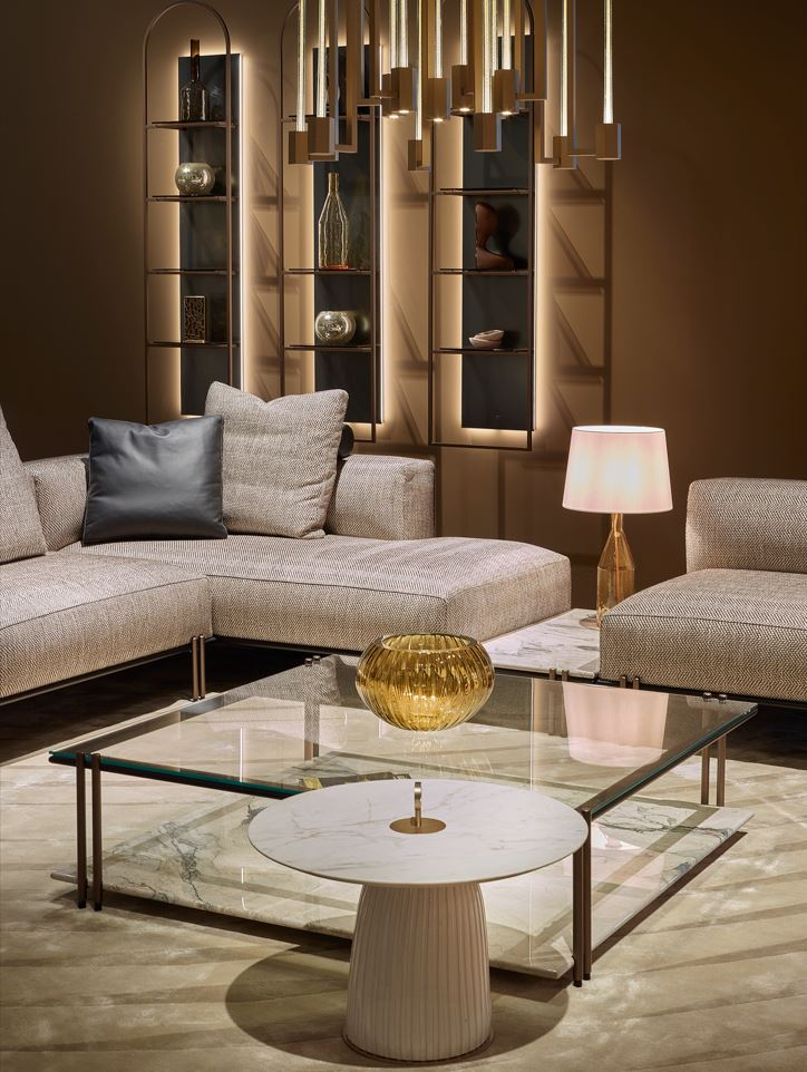 l’abbondante seduta sono il frutto di una costante ricerca nel mondo del living contemporaneo. Cuscinatura sedile e schienale non sfoderabile, realizzata in poliuretano espanso sagomato a quote differenziate. Nel modulo chaise longue con tavolino integrato il piano è realizzato in pietra Pece o in marmo Lunar Breccia.