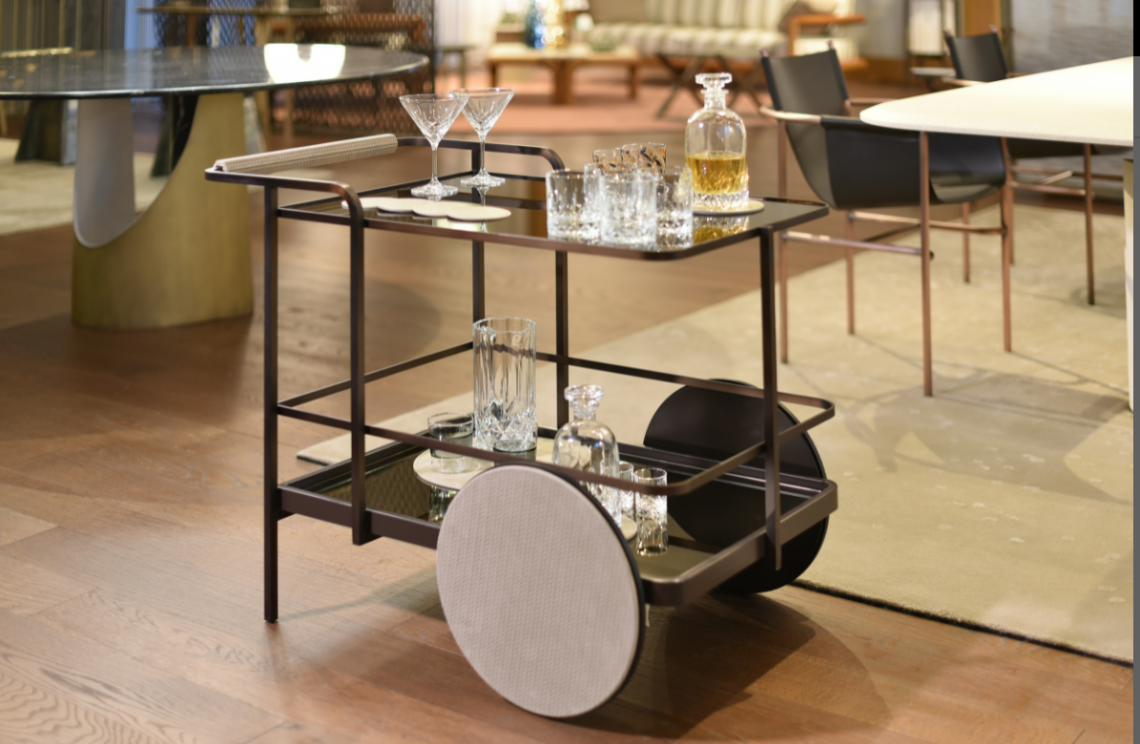Carrello utilizzabile come mobile bar e tavolino. La struttura è in metallo con finitura bronze shadow opaco, il ripiano superiore è in vetro trasparente col. avana e quello inferiore è in vetro specchiato satinato col. bronzo. Le ruote sono rivestite in nabuck con pattern ad intrecci, colore 15 taupe, come la maniglia.