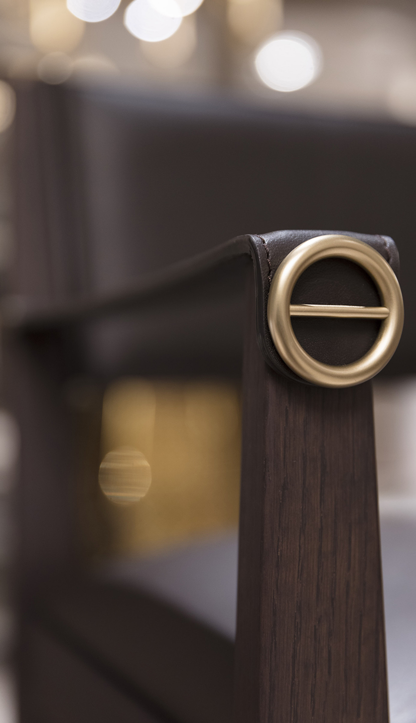 Una sedia polimaterica che profuma di viaggi esotici alla ricerca di un Eden perduto. Ispirata allo stile coloniale lo schienale e la seduta sono rivestiti in cuoio, mentre la ricercatezza della lavorazione della struttura in rovere tinto scuro è esalta dal contrasto cromatico e materico dei preziosi inserti in metallo con finitura oro opaco.