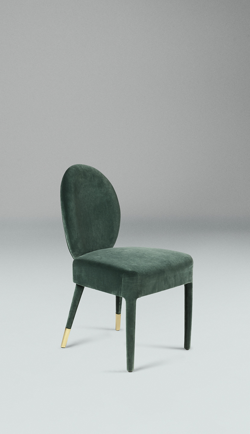 La seduta ha un telaio in legno multistrato curvato e imbottitura in poliuretano espanso sagomato a quote differenziate, mentre le gambe in legno di faggio sono rivestite nel medesimo rivestimento con un prezioso puntale in ottone lucido nelle gambe posteriori. Sofia è interamente rivestita in pregiati velluti non sfoderabili, pelle bovine e nabuk. Sofia è disponibile nel modello con e senza braccioli. Non sfoderabile.