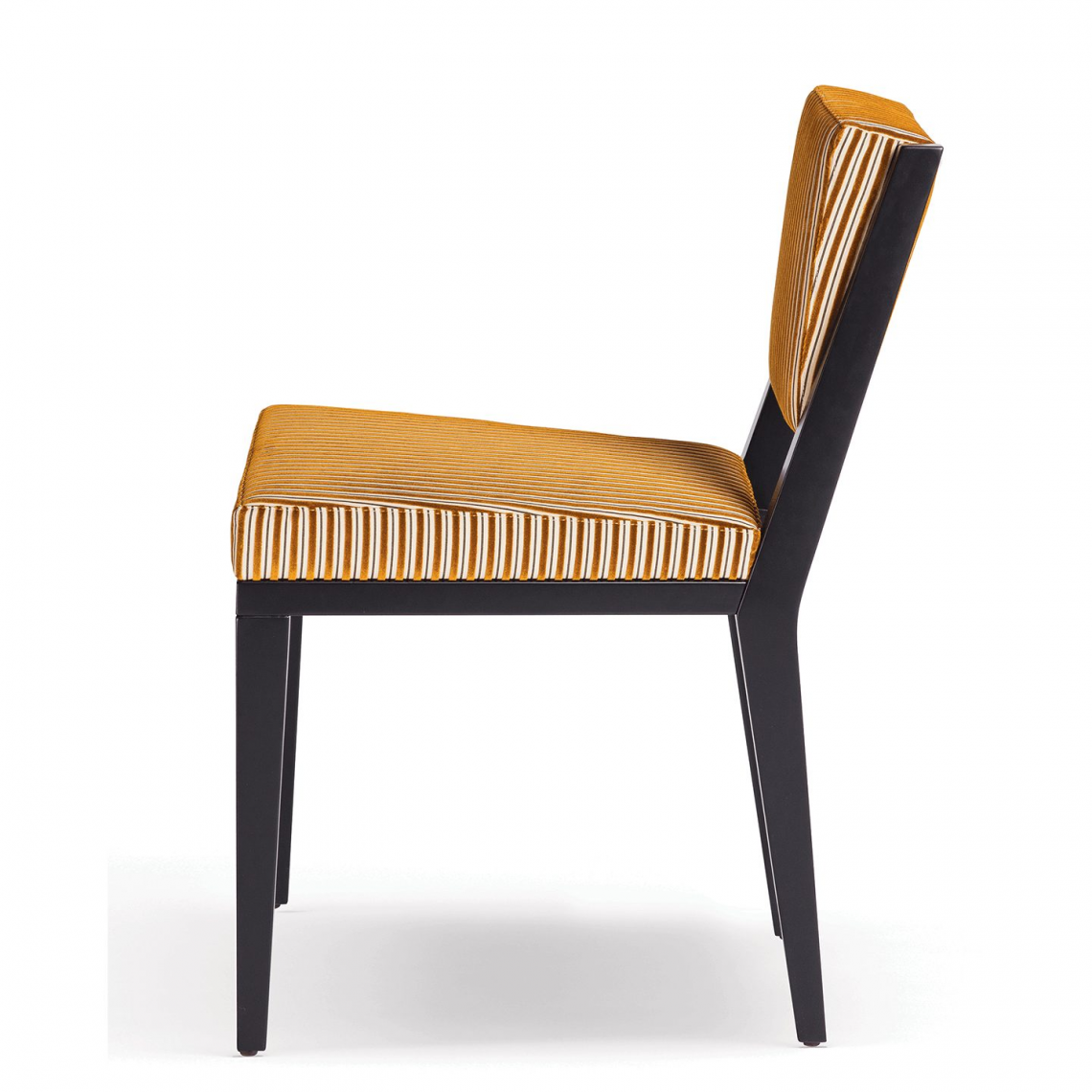 Telaio, essenziale nel disegno ma raffinato nelle proporzioni, in faggio laccato nero opaco con preziosi dettagli in ottone satinato opaco, che garantiscono il fascino a questa seduta estremamente versatile. Imbottitura in poliuretano espanso sagomato a quote differenziate. Rivestimento disponibile in pregiati tessuti, pelli bovine e nabuk. Non sfoderabile.