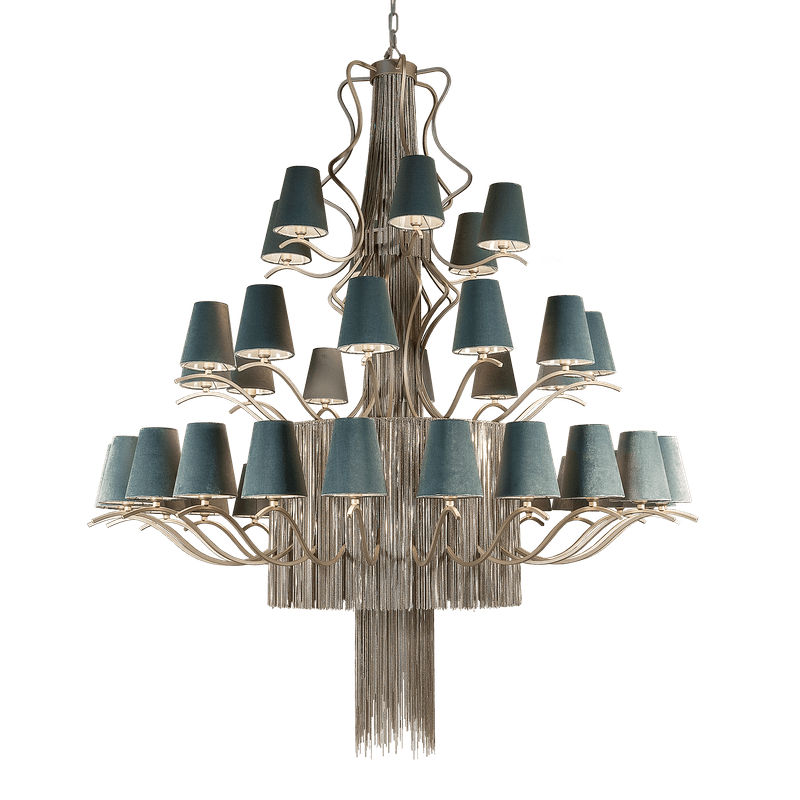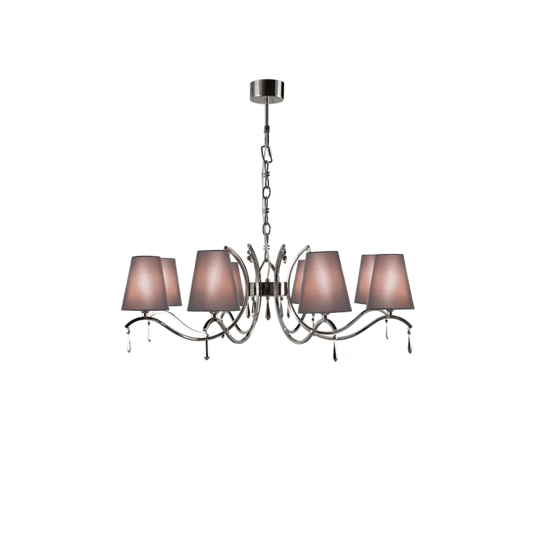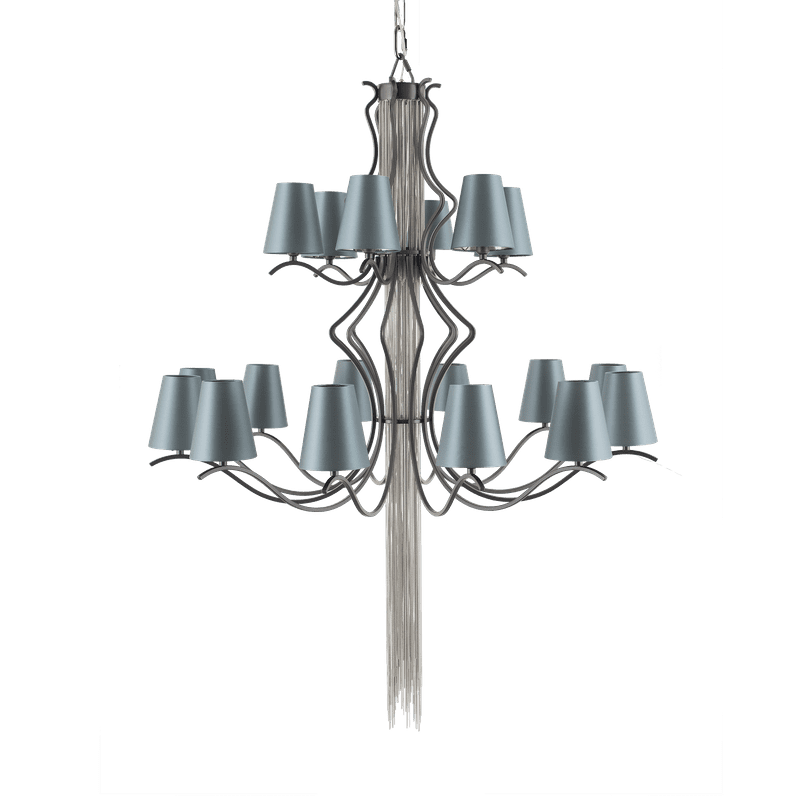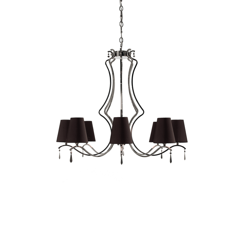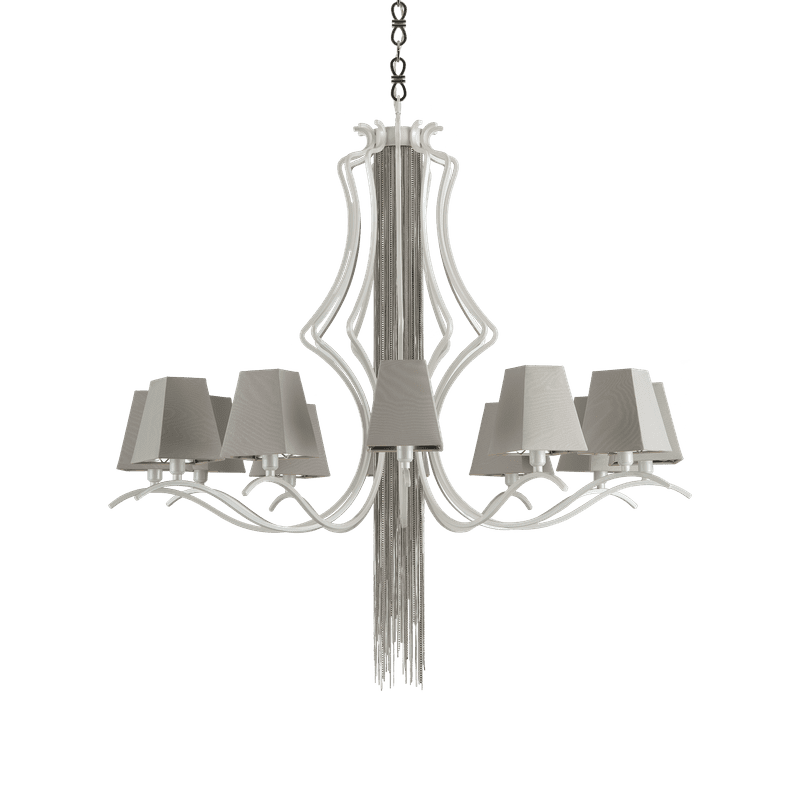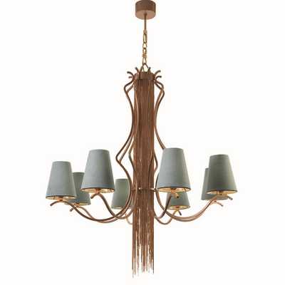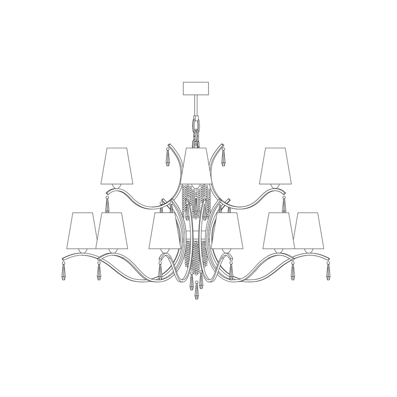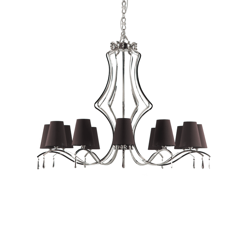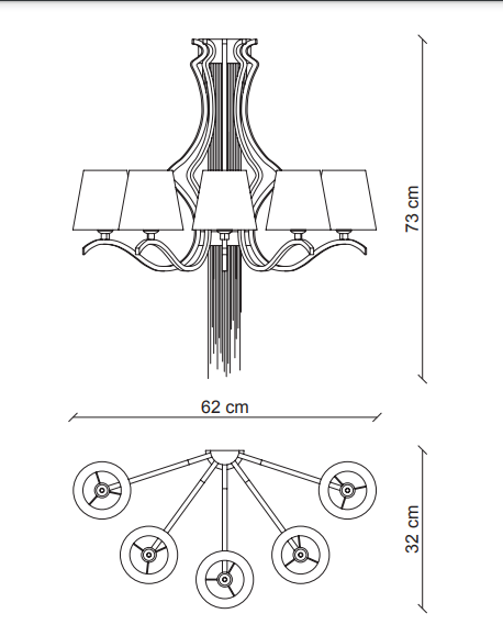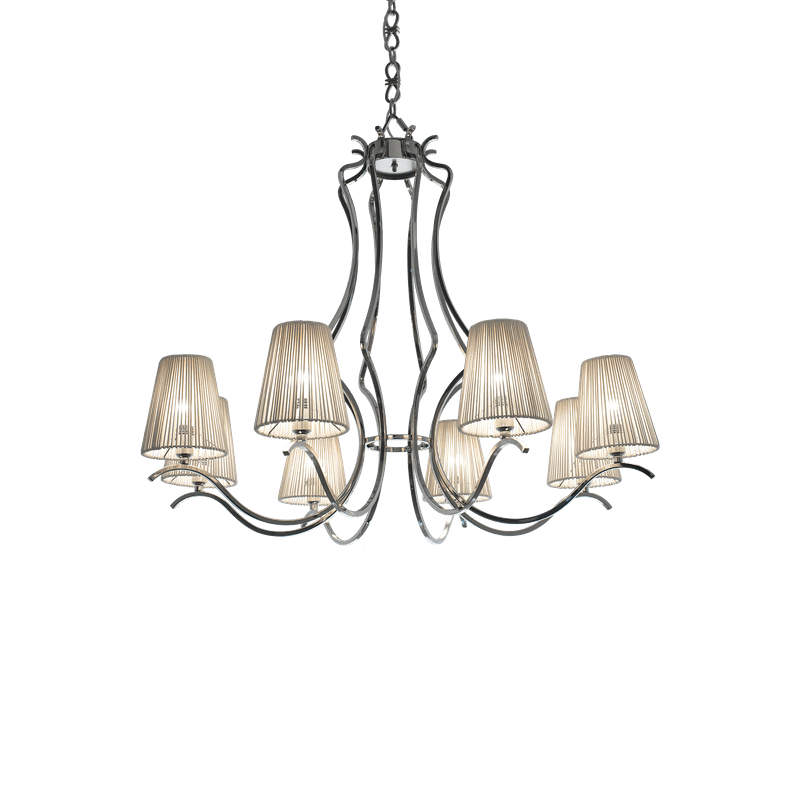A series of metallic bending ramifications that unravel in space, starting from a branching point. A vibrating structure that sustains a carousel of delicate lampshades. A lamp which joins a retro style with the allfeminine habit of tout-court decoration.