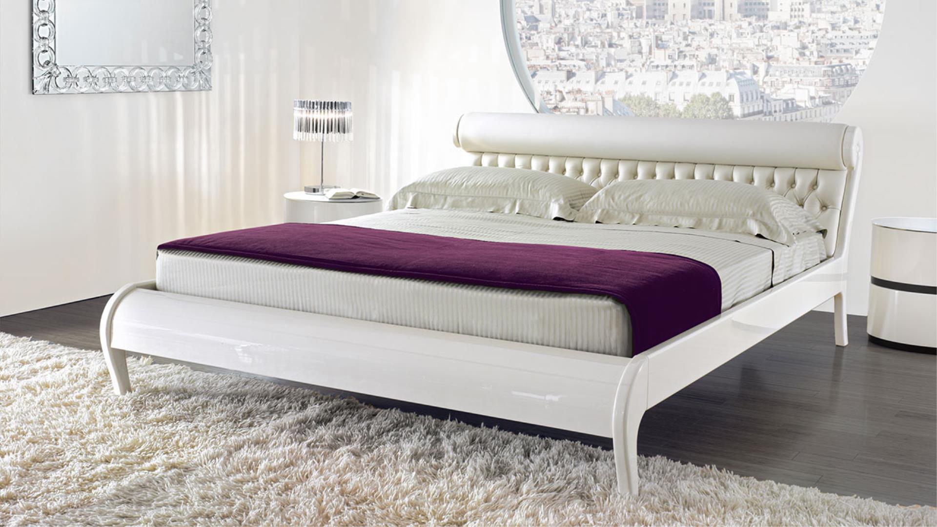 Bed with head and footboards in lathed solid wood, cherrywood or shiny lacquered finish.