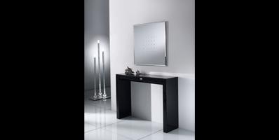 Console in shiny lacquered wood with applications of bevelled lacquered glass on top and fronts. Drawer with pen holders. Also available with crystal or Murano glass handle.