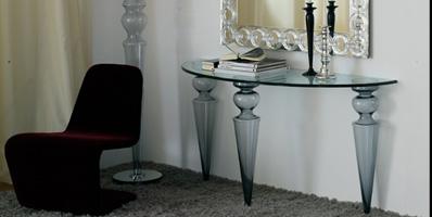 Console with legs in Murano glass transparent, coloured or Platino finish or ribbed transparent or gold. Glass top 15 mm thick with 45° bevel.;