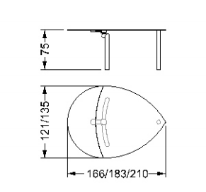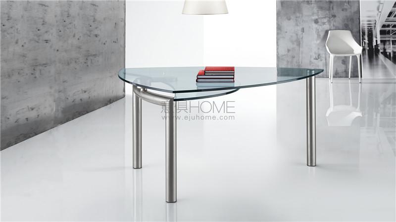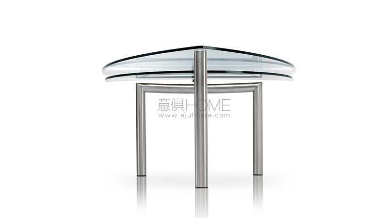 Extension table. Tempered shaped glass top and extension 15 mm thick. Legs in glazed inox-steel, round shape.