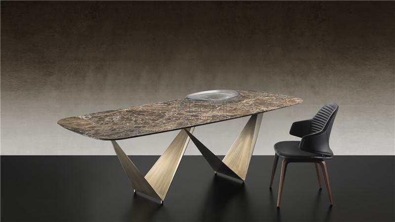 Dining table. Metal bases in Grafite, scratchy steel or in satin brass or titanium finishing. Top in tempered 15mm thick transparent glass.