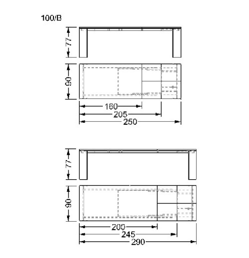 Extension table with top in lacquered or etched lacquered glass. Single or double extension 45cm or 94cm long with double leaf opening, covered in glass, matching with the top. Legs in lacquered or etched lacquered 15 mm thick glass with wheels.