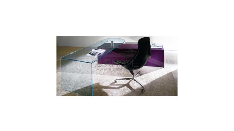 Desk in transparent glass 12 mm thick with rotating support in brushed steel with cable-hole. Sideboard covered in lacquered or etched lacquered glass with two sliding doors.