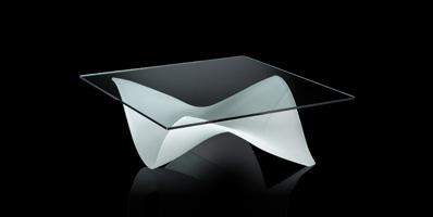 Coffee table with base in curved extraclear, bronze or smoke-grey glass with sandblasted finish.Available also in sandblasted and lacquered glass.Glass top 12 mm thick.
