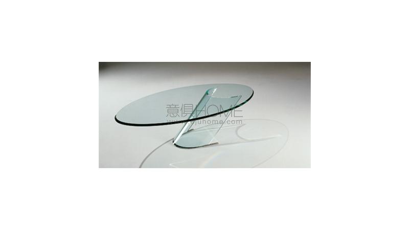 Coffee table with oval glass top 12 mm thick with 45° bevel and base in curved glass 12 mm thick.