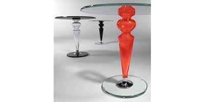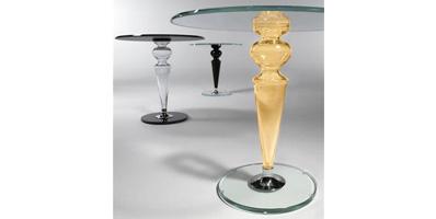 Side table with leg in Murano glass: smooth transparent, coloured or Platino finish or ribbed transparent or gold; base in 10 mm thick transparent, extraclear, mirror, lacquered or Antique mirror glass; top in 10mm thick transparent, extraclear or lacquered glass with 45° bevel.