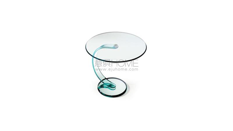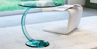 Side table with base in mirror glass and curved 19 mm thick glass support. Glass top 10 mm thick with 45° bevel.