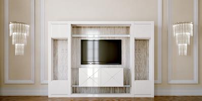 Modular bookcase in shiny lacquered wood with application of bevelled lacquered glass or in shiny ebony wood with backs in Dune pattern design glass. Optional LED lighting,  wood or glass doors in various sizes with possibility of engravings and handles. TV-unit module with double door storage in shiny lacquered wood with bevelled lacquered glass applications. can be joint to the Libreria to create various types of compositions.